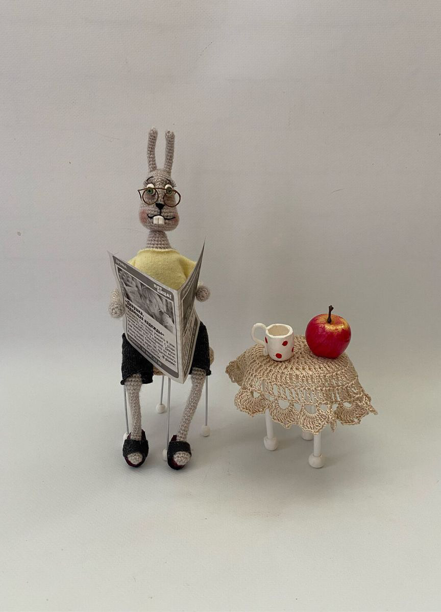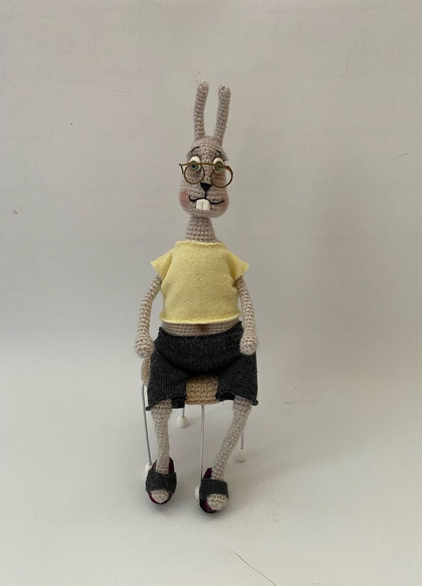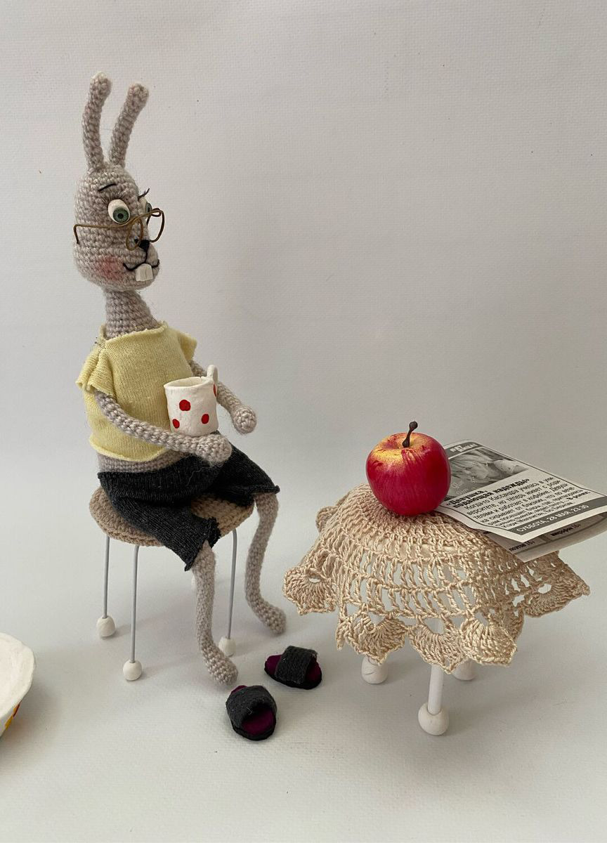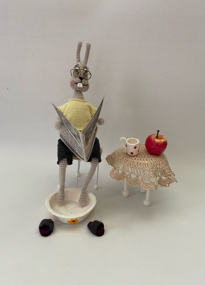 Вот такой уютный зайка пенсионер станет деталью вашего интерьера. Любит попить чайку посиживая на табурете с газеткой , а может и ножки попарить.