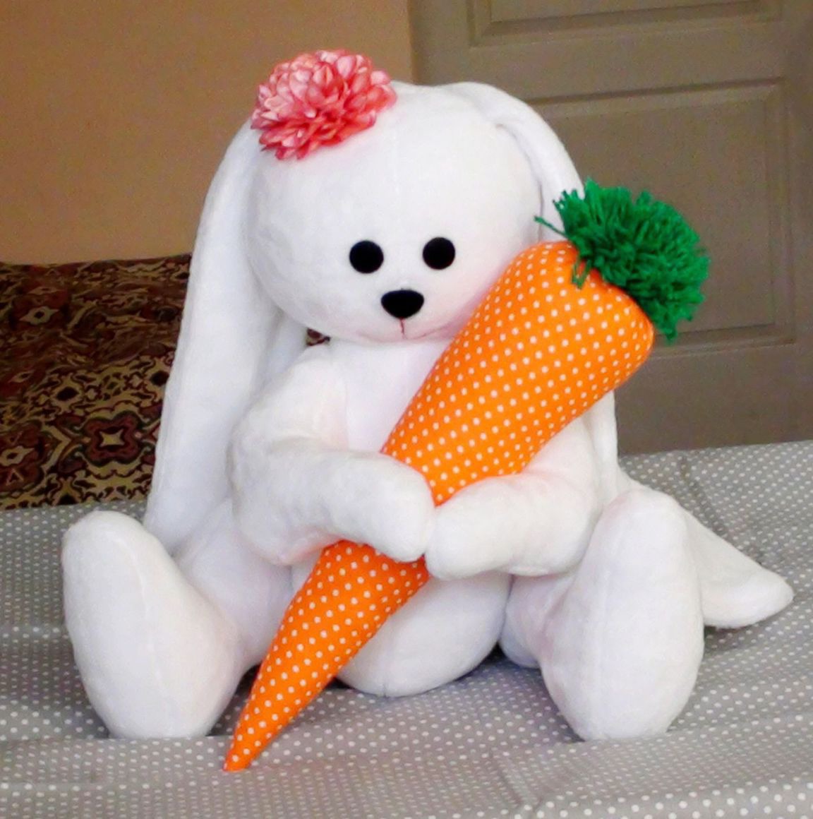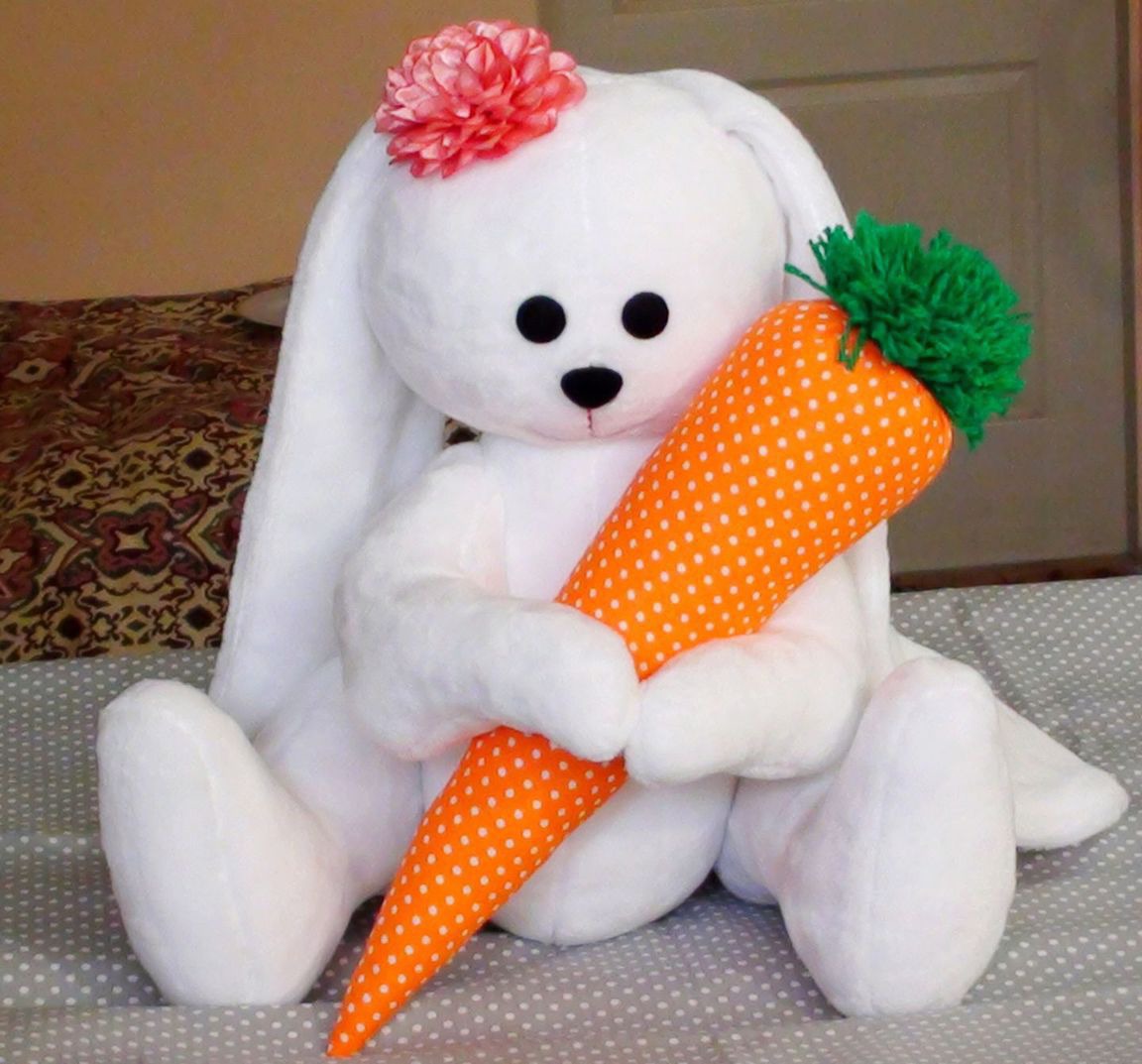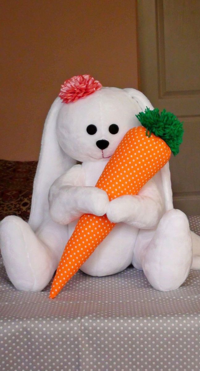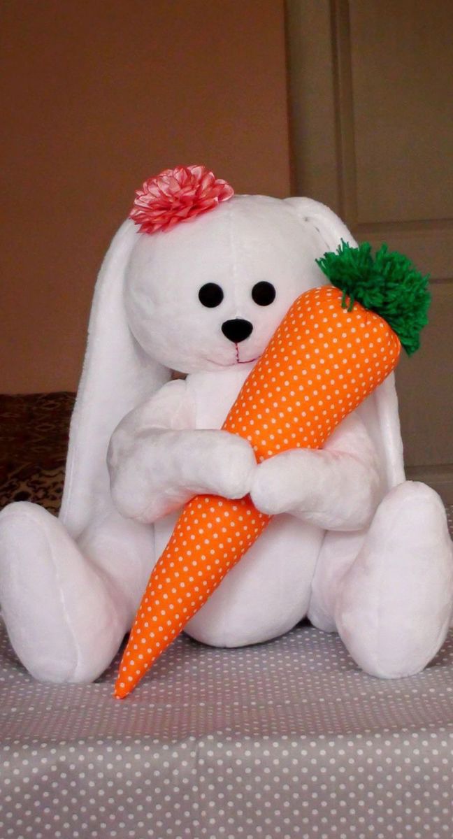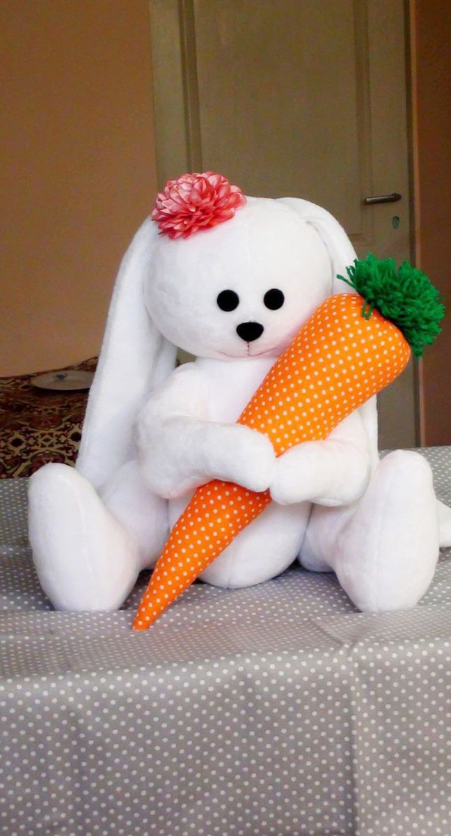 Большой зайка с морковкой , сшит из ткани велсофт очень нежный , мягкий и приятный на ощупь . Высота зайки 30 см. ( сидя ) 45 см. ( стоя )