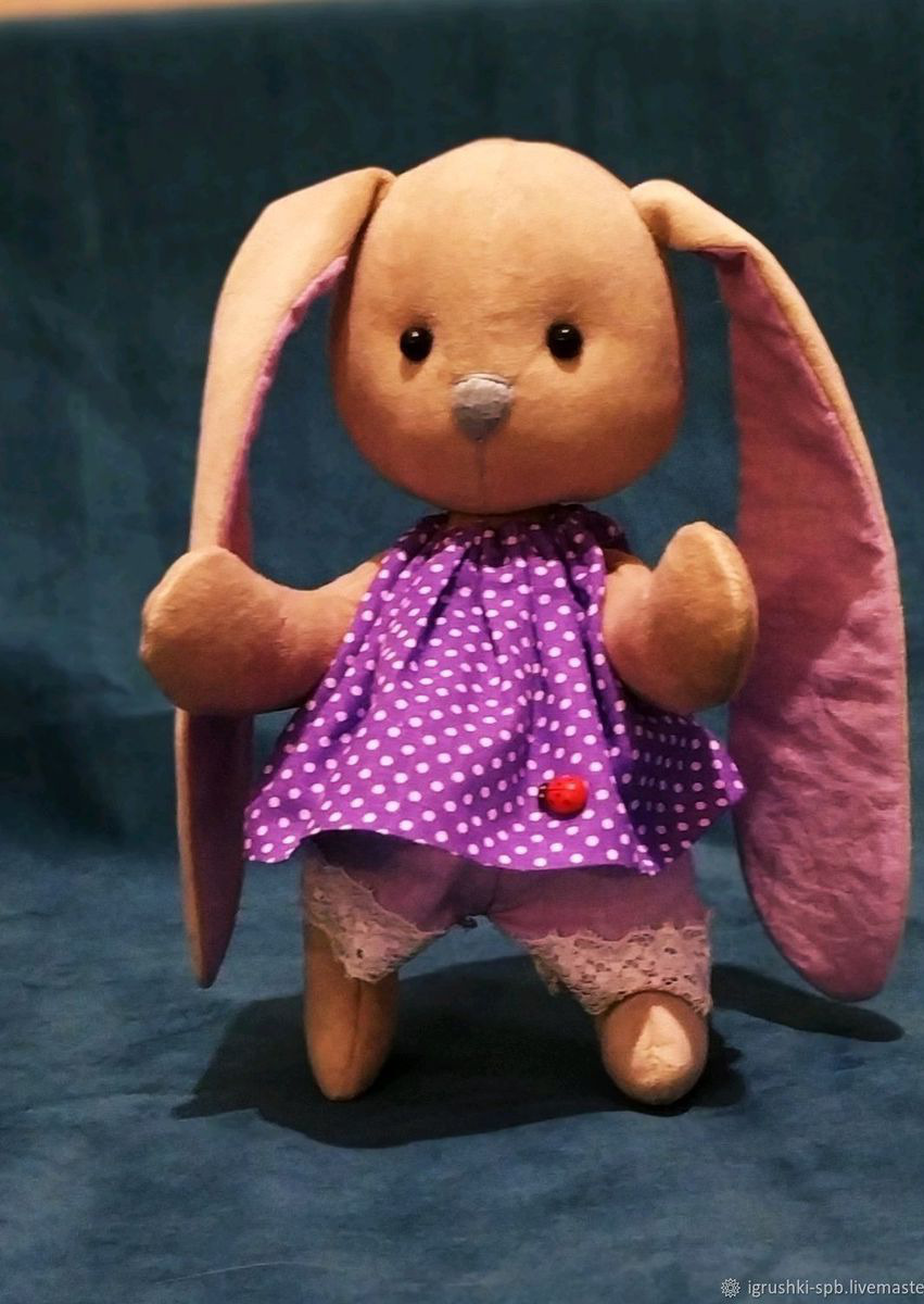 Озорная заинька в летнем сарафанчике. Рост 22 см. Сшита из велюра. Наполнитель синтепух. Будет лучшей подружкой для девочки.