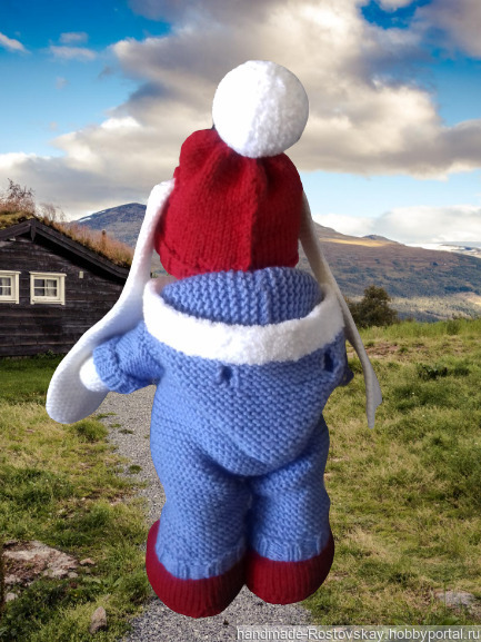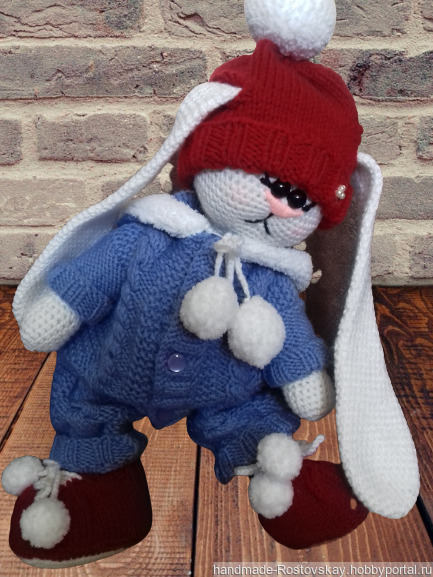 Заинька связан крючком, наполнитель холлофайбер.Одежда изготовлена спицами.Рост игрушки 36 см.Самостоятельно стоит, сидит, двигает ручками и ножками. Одежда полностью снимается.Возможна стирка как самого Зайца , так и одежды.