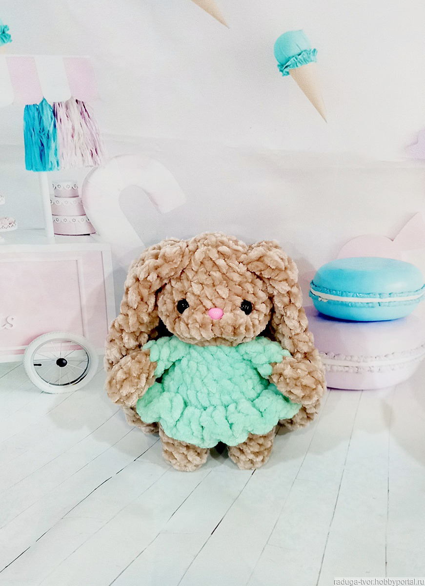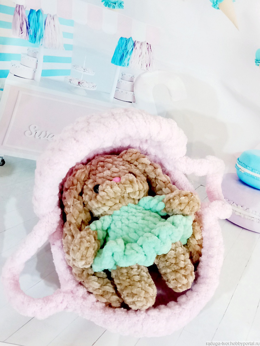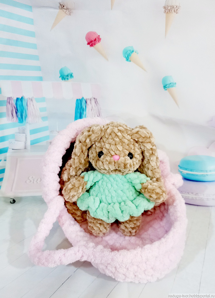 В него входит вязаная зайка и люлька, где можно укладывать игрушку спать.