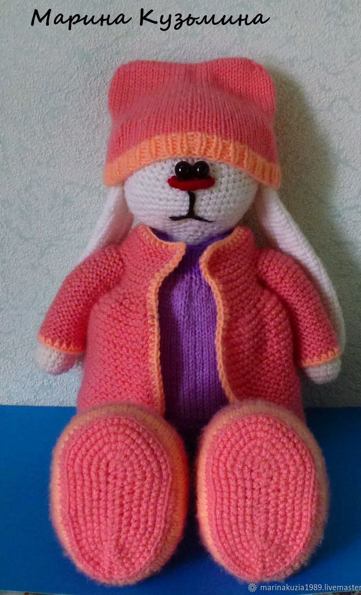 Зайка в стиле Тильда связан крючком из полушерстяной пряжи, одежда на зайку связана спицами из 100% акрила. Внутри наполнитель. Глазки сделаны из бусин.Зайка высотой 34 см. Одежда снимается. Может самостоятельно стоять и сидеть. По желанию могу связать зайку другим цветом (серым, коричневым, бежевым), также и одежда может быть связана на ваш вкус. Зайка станет прекрасным подарком для малыша.