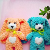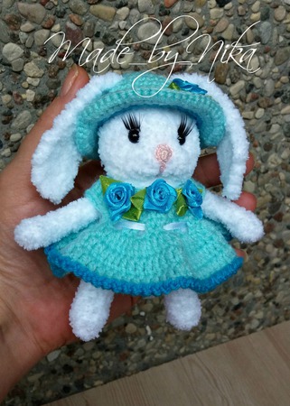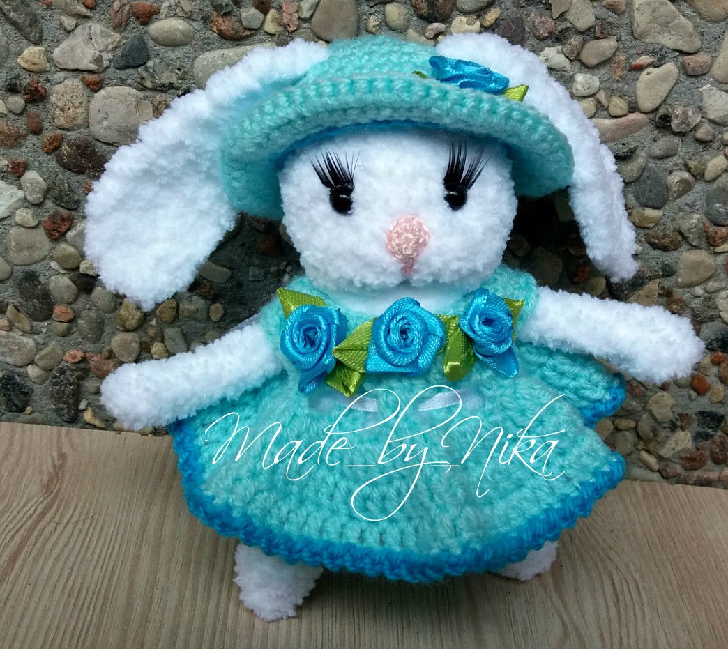 Зайка связана из плюшевой пряжи-очень мягкая и тискательная.Ножки подвижны,Зайка может самостоятельно сидеть.