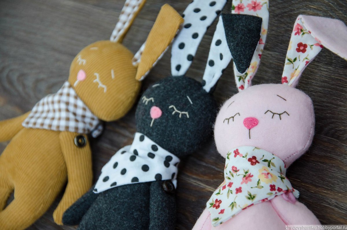 Тискательные зайцы-сплюшки выполнены из натуральных материалов, наполнитель - холлофайбер.