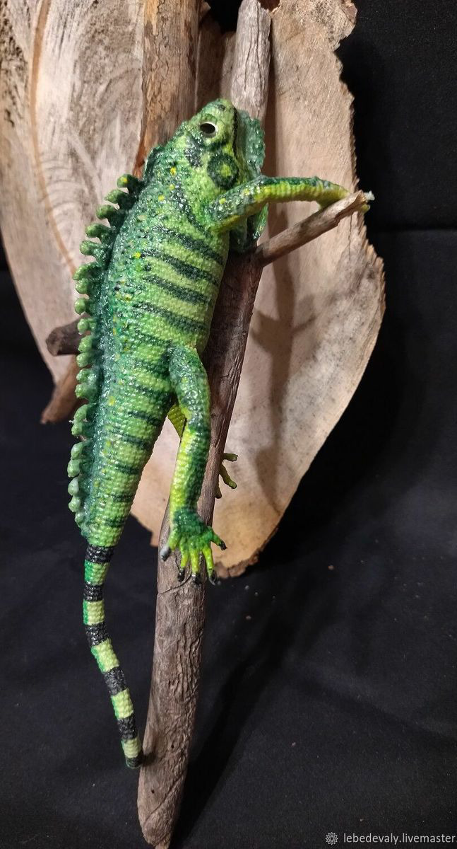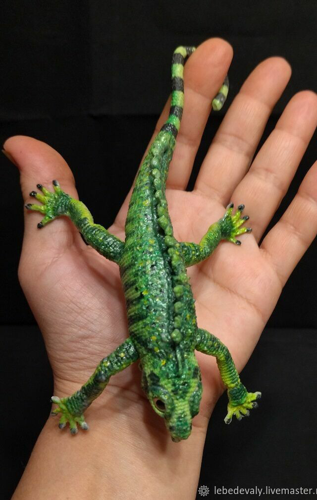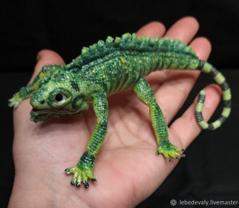Игуана связана из хлопковых ниток, лапки и хвост армированы медной проволокой, подвижны.