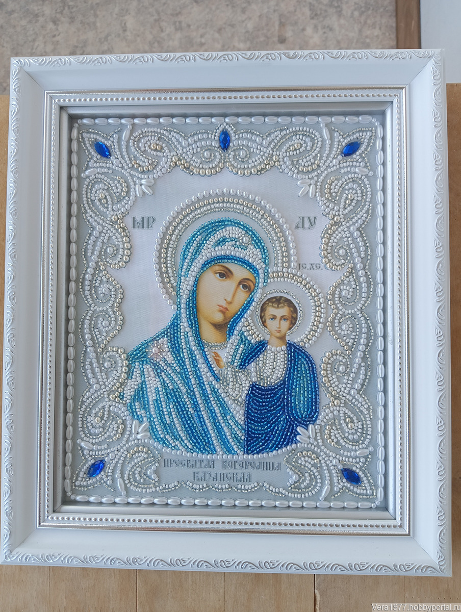 Икона вышитая бисером, камнями, бусинами, оформлена в багет под стеклом