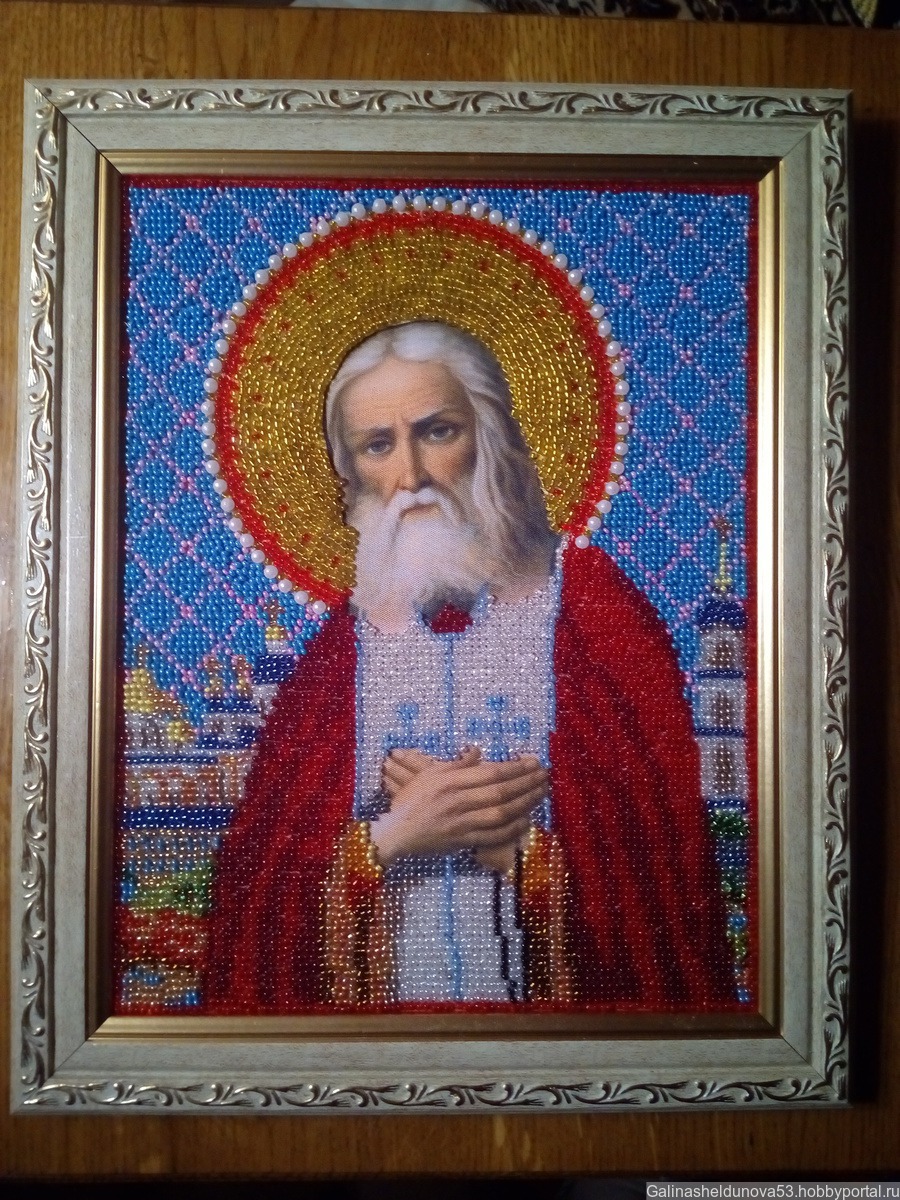 Икона выполнена из чешского бисера размер 19х24 с багетной рамкой размер 30х24