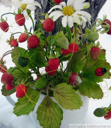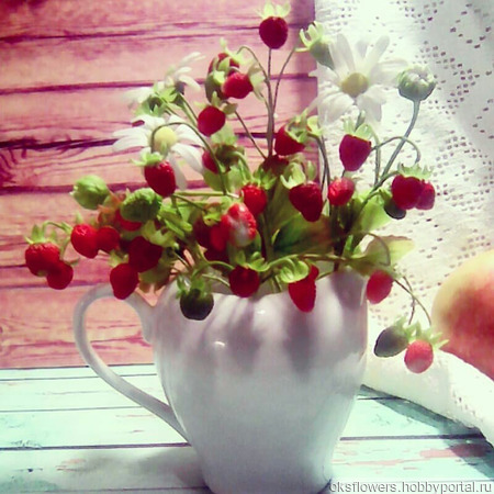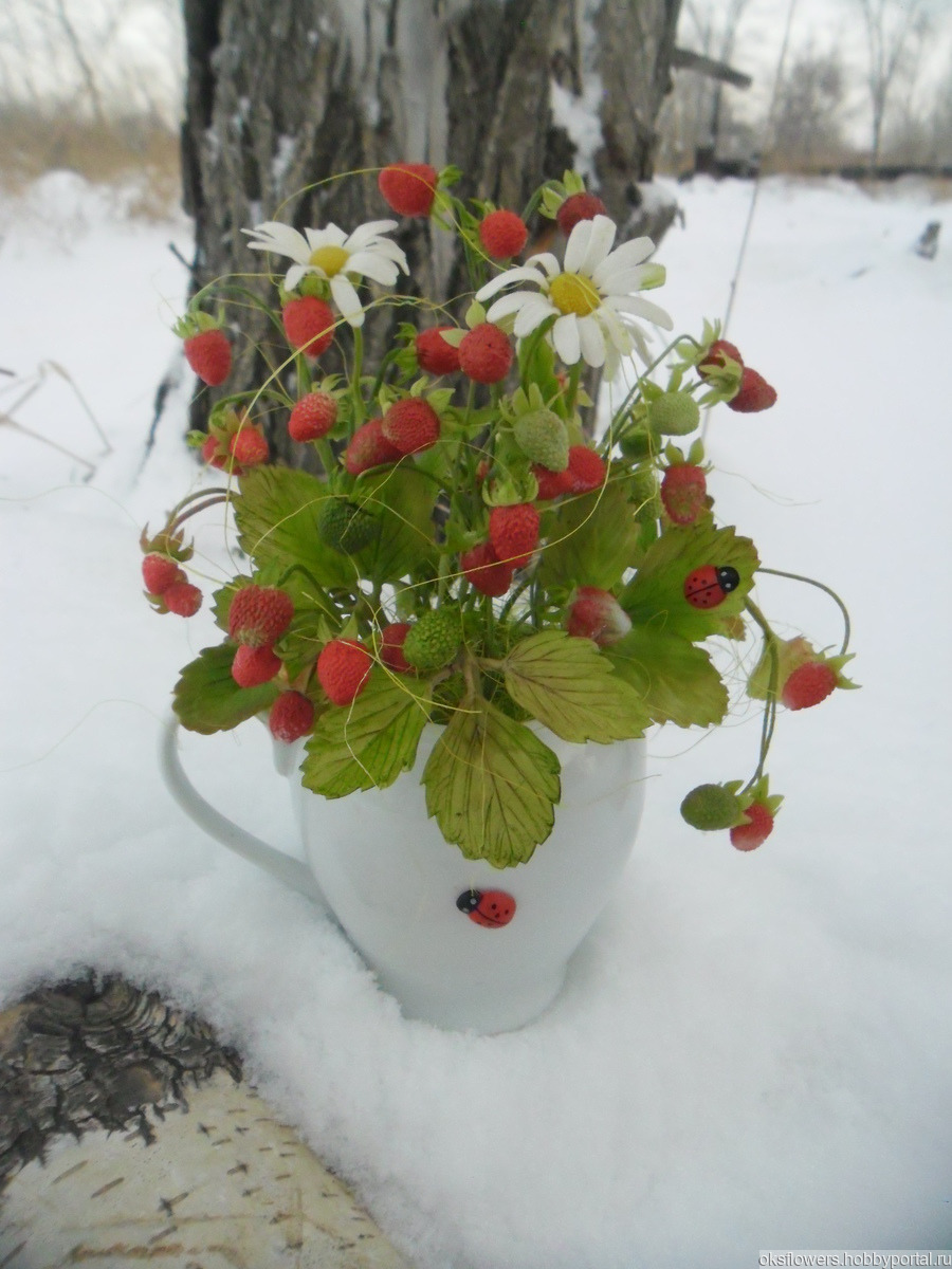 веточки земляники из полимерной глины . цена указана за одну веточку(3 ягодки .1 цветочек .1 веточка листьев) можно заказать веточками . можно композицией посаженых в кружечки . молочники. горшочки . т.д. всё подвижно. лето не уйдёт из вашего дома никогда.а какой это оригинальный подарок!!!!!