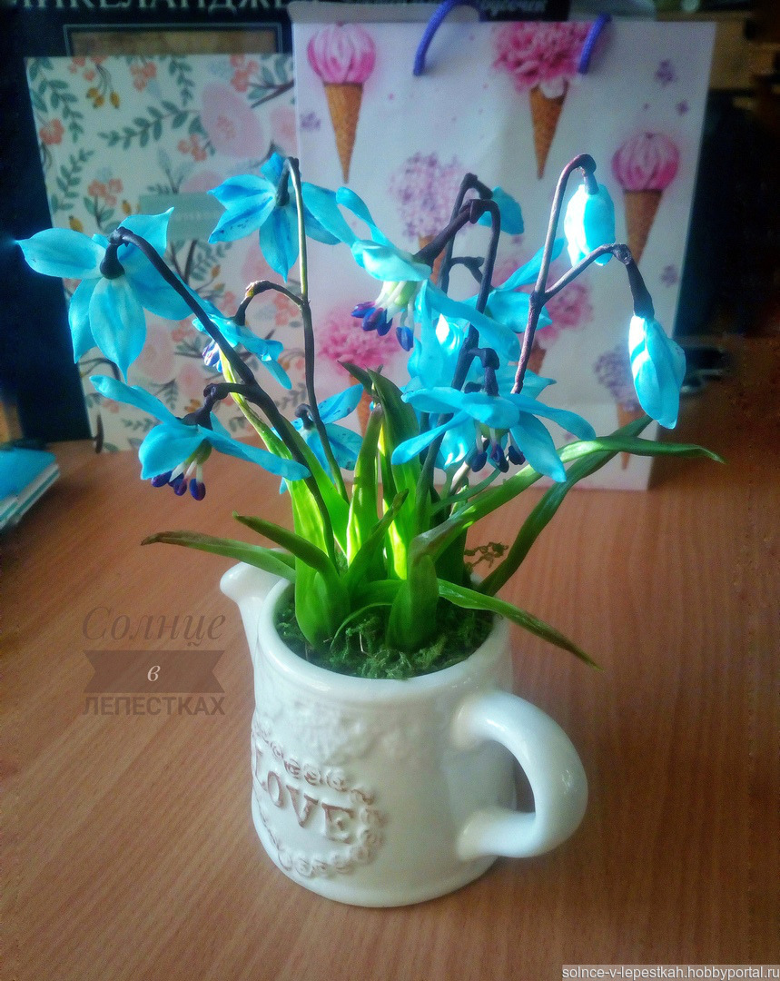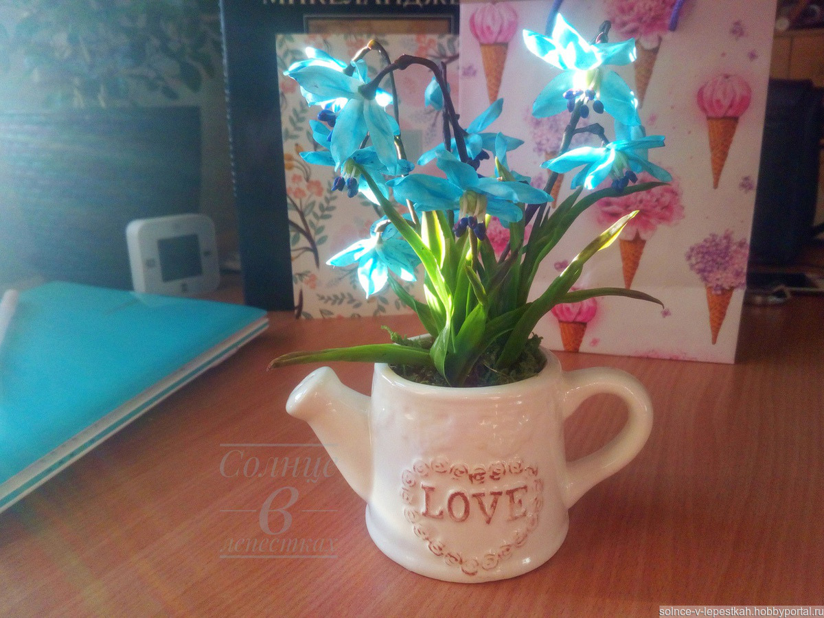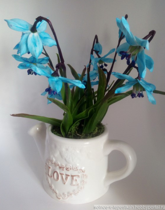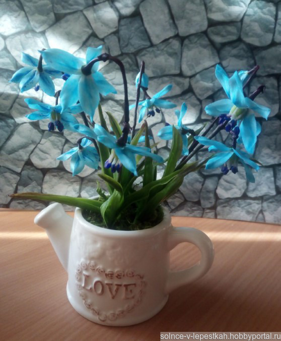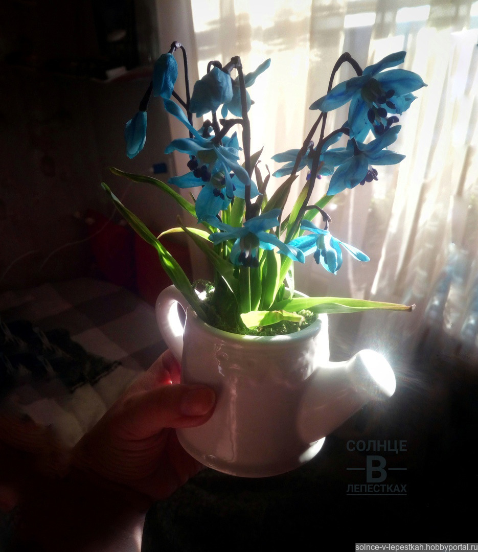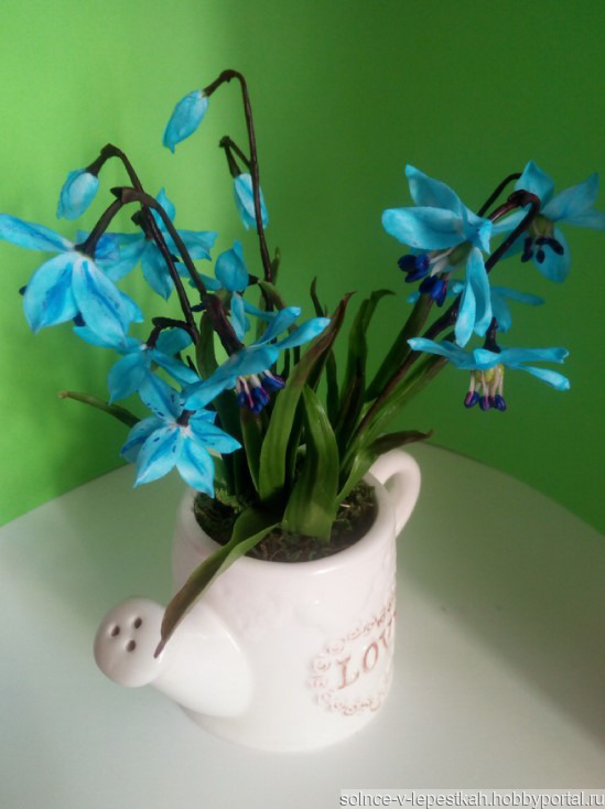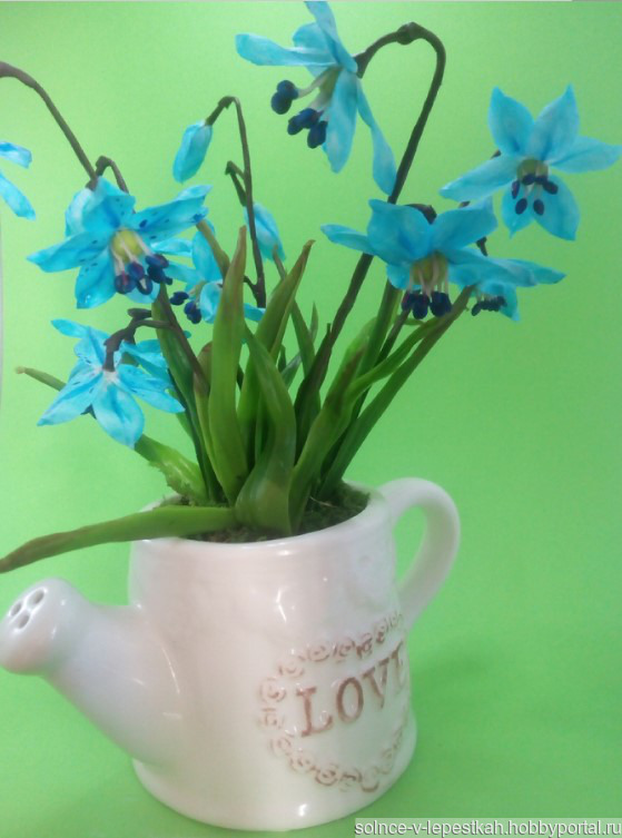 подарок маме, подарок девушке, лейка, подарок бабушке, холодный фарфор, керамическая флористика, полимерная глина, цветы ручной работы, подарок 8 марта, подарок подружке, весенние цветы, Интерьерная композиция, первоцветы, голубые цветы, цветы в интерьер, цветы в подарок, пролеска, голубые подснежники, цветы в лейке