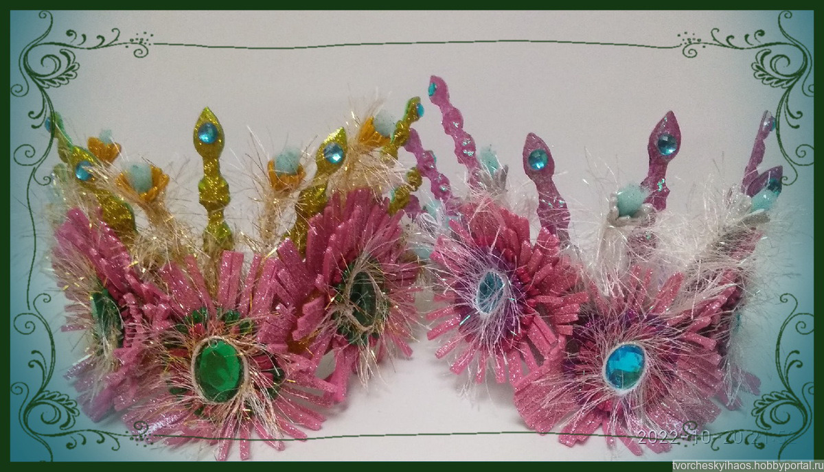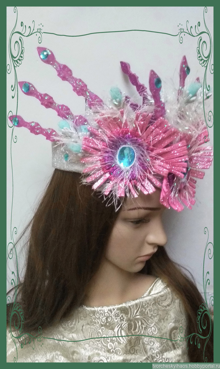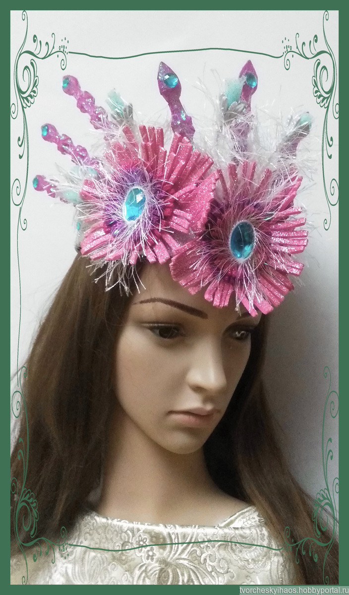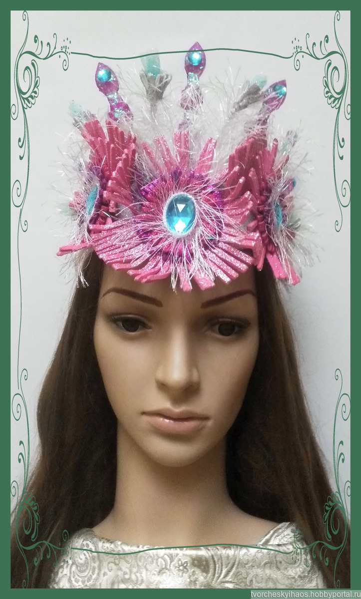Универсальная диадема, которая подойдёт для образа феи, бабочки, русалочки, а также будет очень выигрышно смотреться в костюме для полинезийских танцев. В наличии есть ещё подобная диадема с другим цветом стразов и лучей. Смотрите фото.