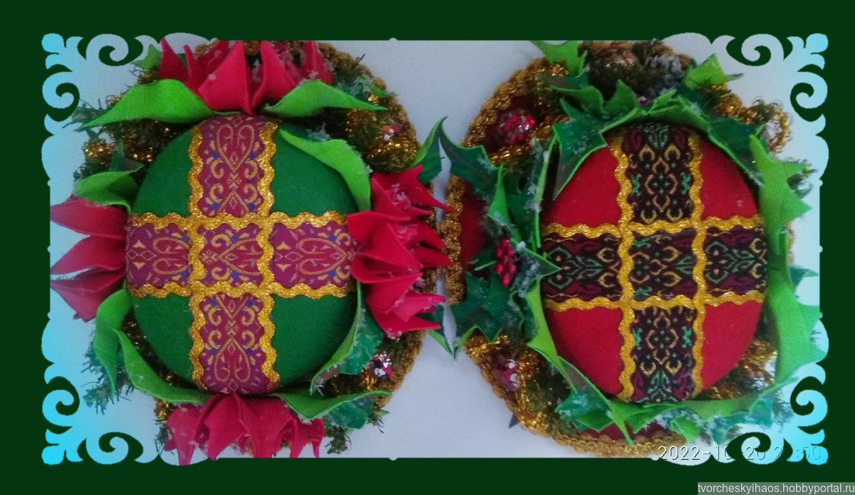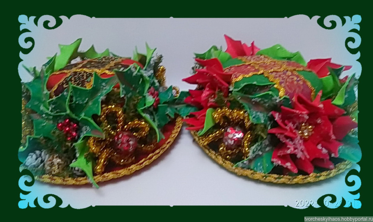 Материалы: фетр, бархатный фоамиран, тесьма, бусы, мишура, искусственная зелень и ягоды.