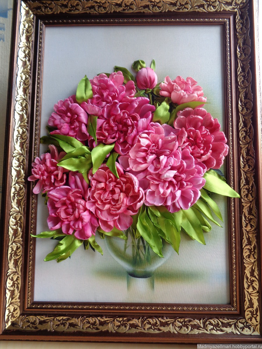 Интерьерная картина "Пионы" вышита мастером атласными лентами по принту, окрашивание в процессе работы.Картина оформлена в багет изготовленный по индивидуальному заказу. Размер картины 52 х 36 см.