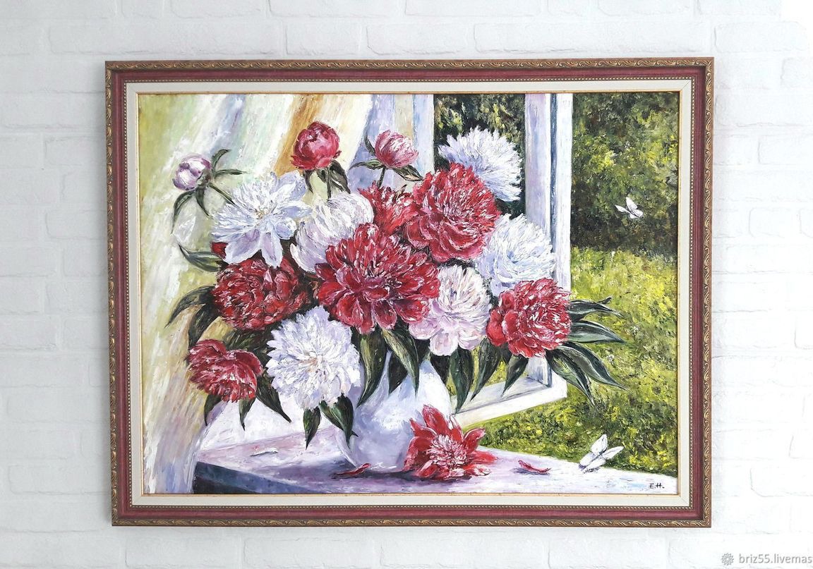 зелёный, розовый, окно, цветы, бабочки, 8 марта, коричневый, букет, картина для интерьера, фен-шуй, картина в подарок, картина с цветами, картина маслом, интерьерная картина, символ любви, рама, картина на холсте, белые пионы, бордовые пионы