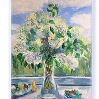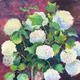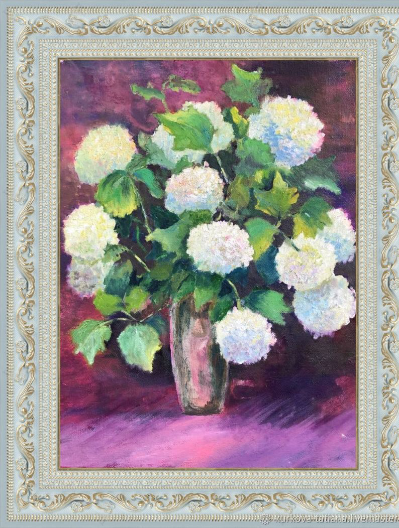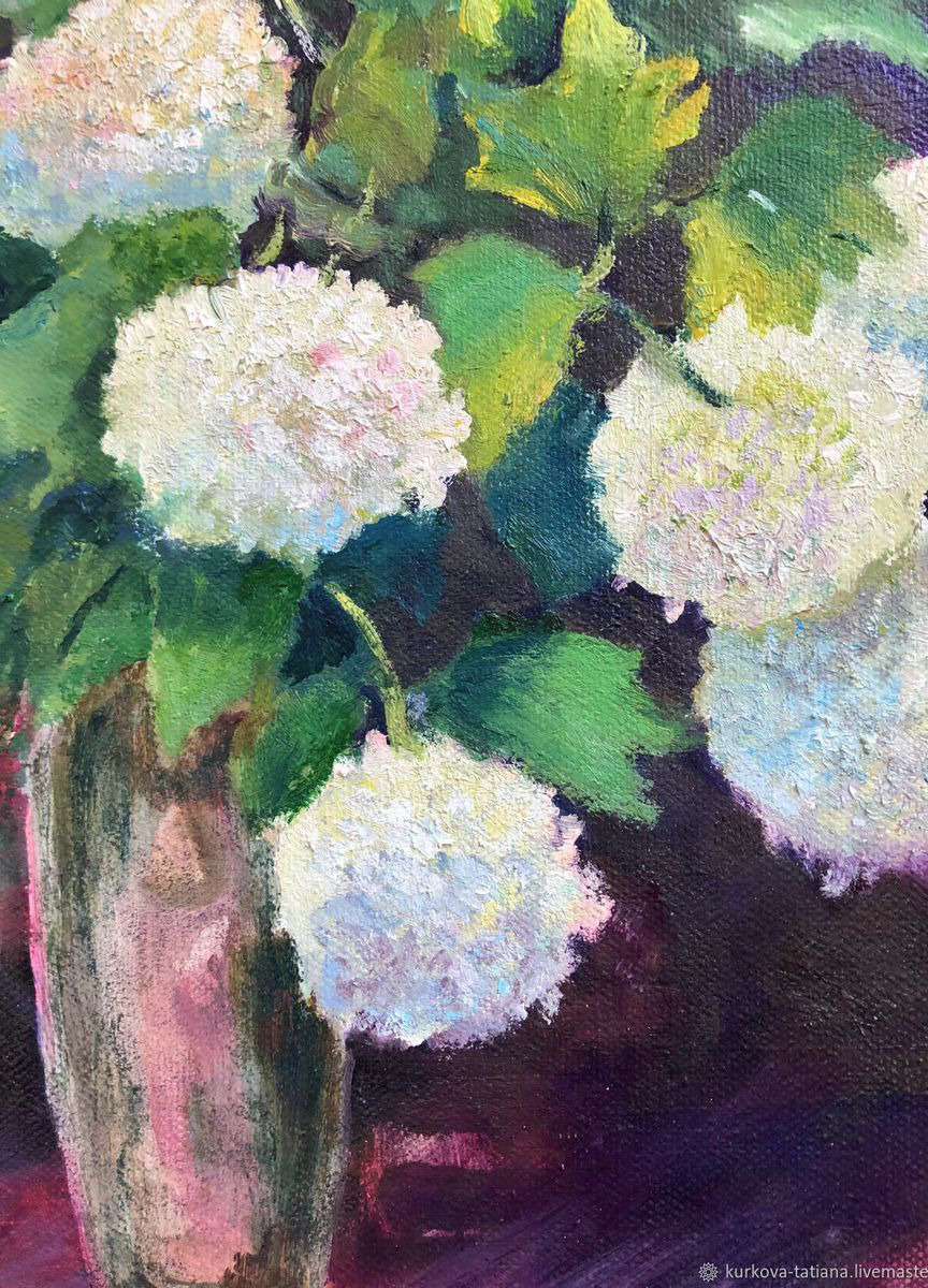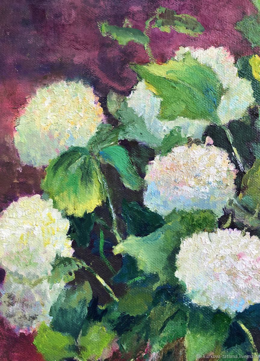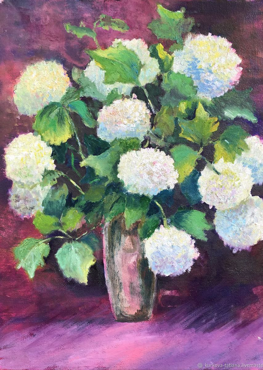 Картина маслом букет больших белых цветов написана с натуры. Бульденеж растет в моем саду. Однажды теплым дождливым вечером я собрала в букет большие шапки белых цветов и перенесла их на холст.