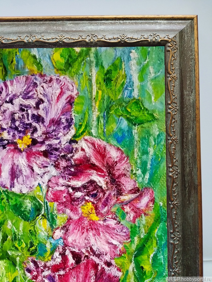 Авторская картина Ирисы, оригинал, оргалит/масло, художник Любовь Прусик. Картина оформлена в багетной мастерской в раму. Размер рамы по внешнему периметру 43*29 см.