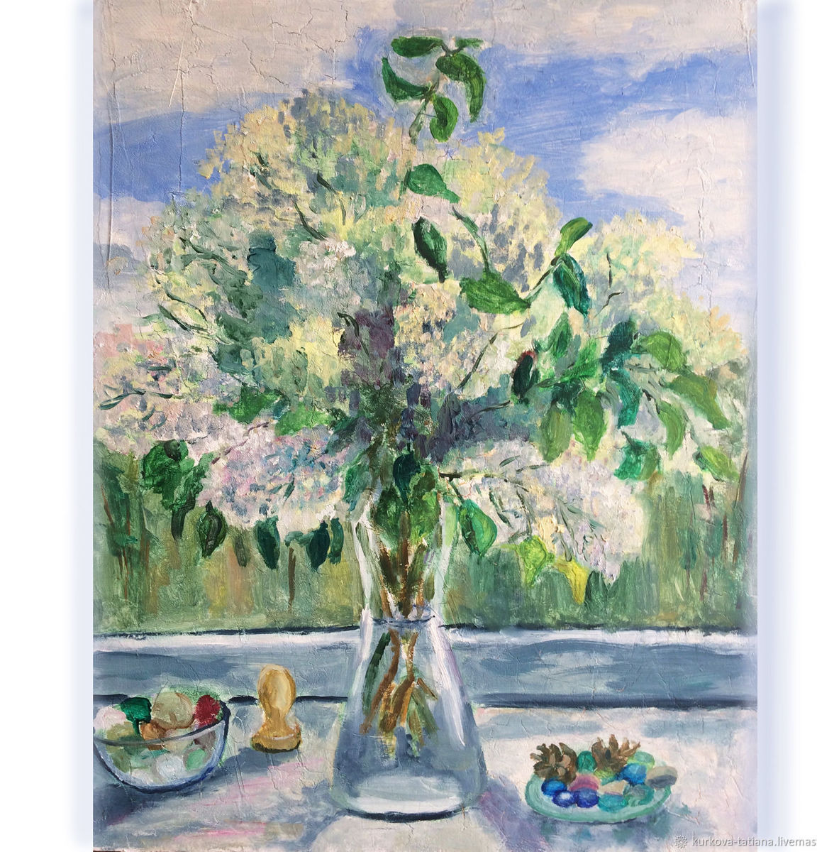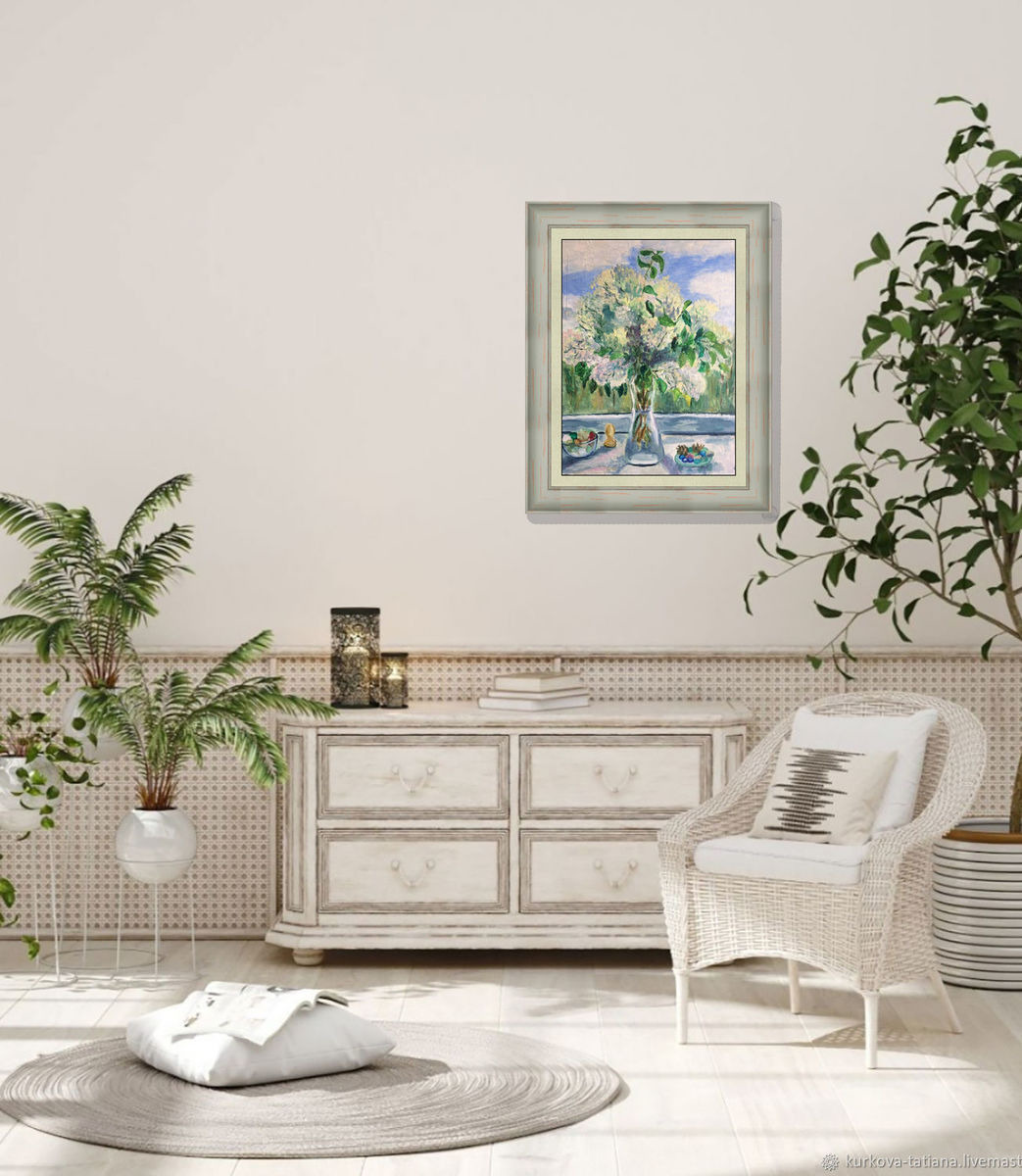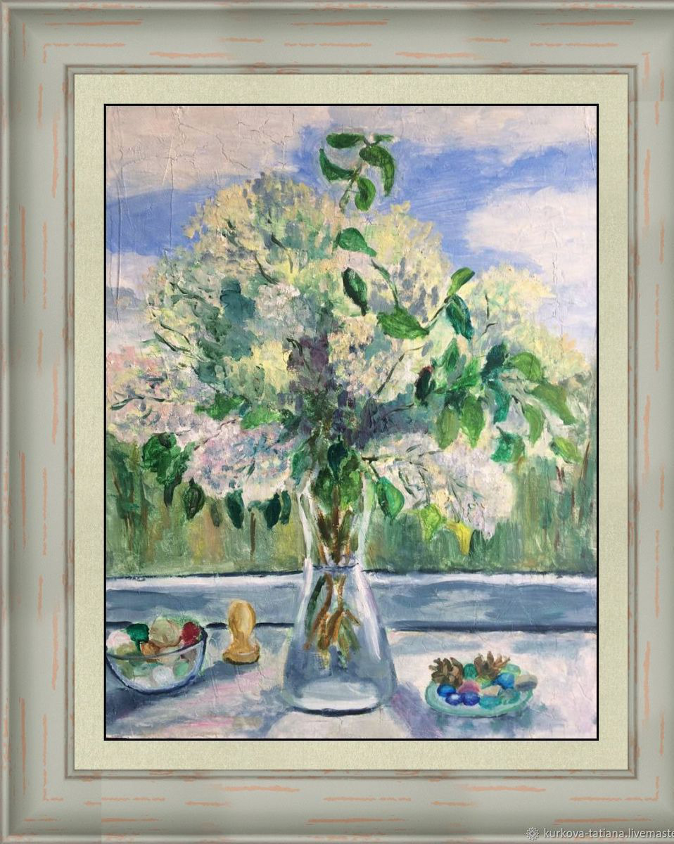 Картина Белая сирень на на окне написана масляными красками на холсте на деревянном подрамнике.