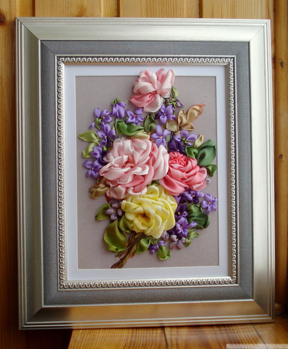 Букет роз и фиалок. Нежная вышивка лентами из натурального шелка, Основа - габардин. Оформлено в серебристую рамочку без стекла. У рамки есть ножка для размещения вышивки на столе.