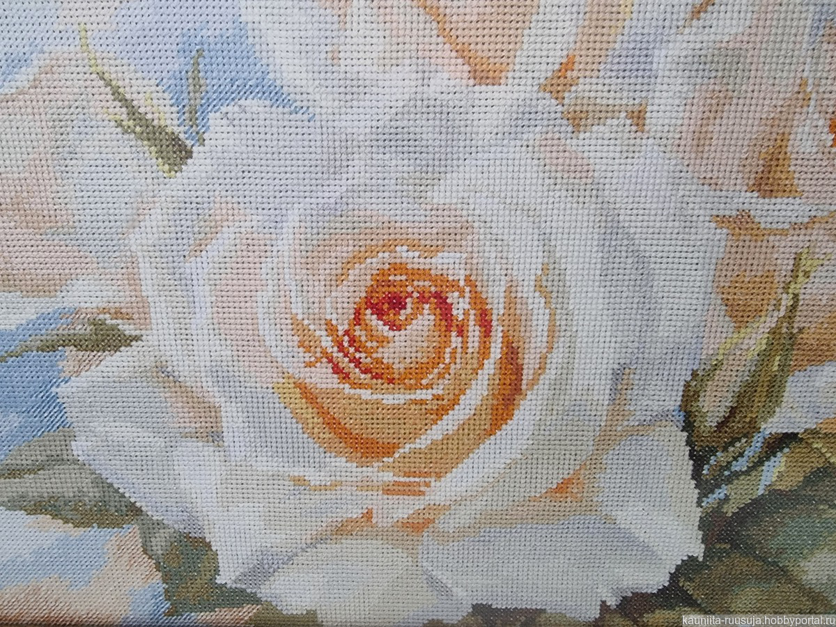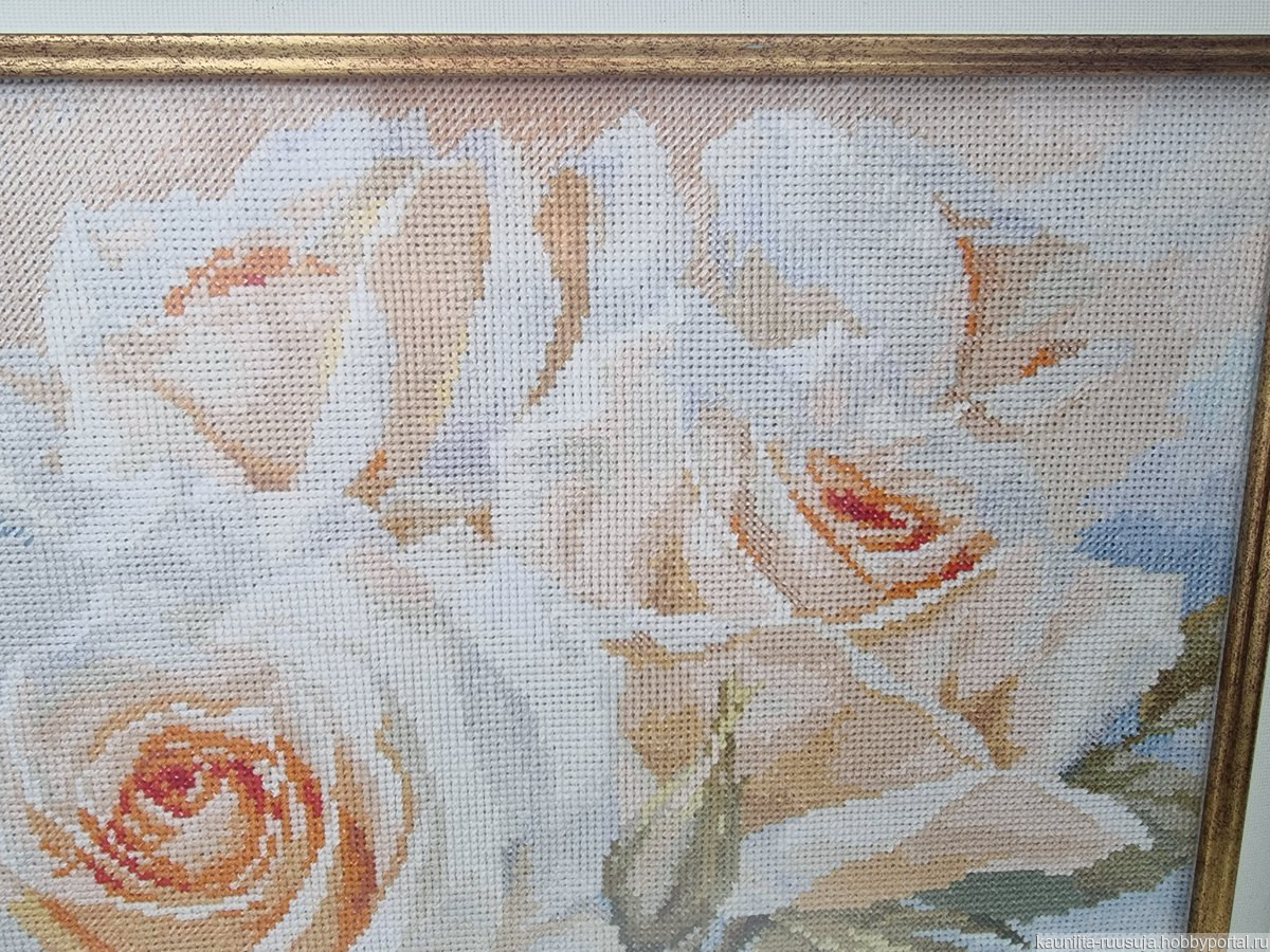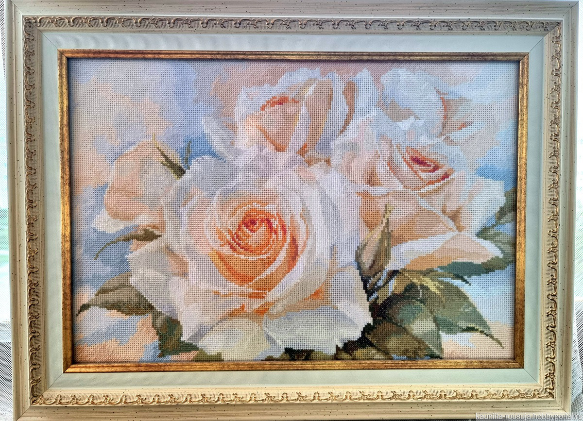 Вышитая картина "Розы". Уютный сюжет, теплые цвета. вышивка выполнена на канве Aida 14. Использовано 28 цветов нитей. Оформлена в багетной мастерской с использованием антибликового стекла.