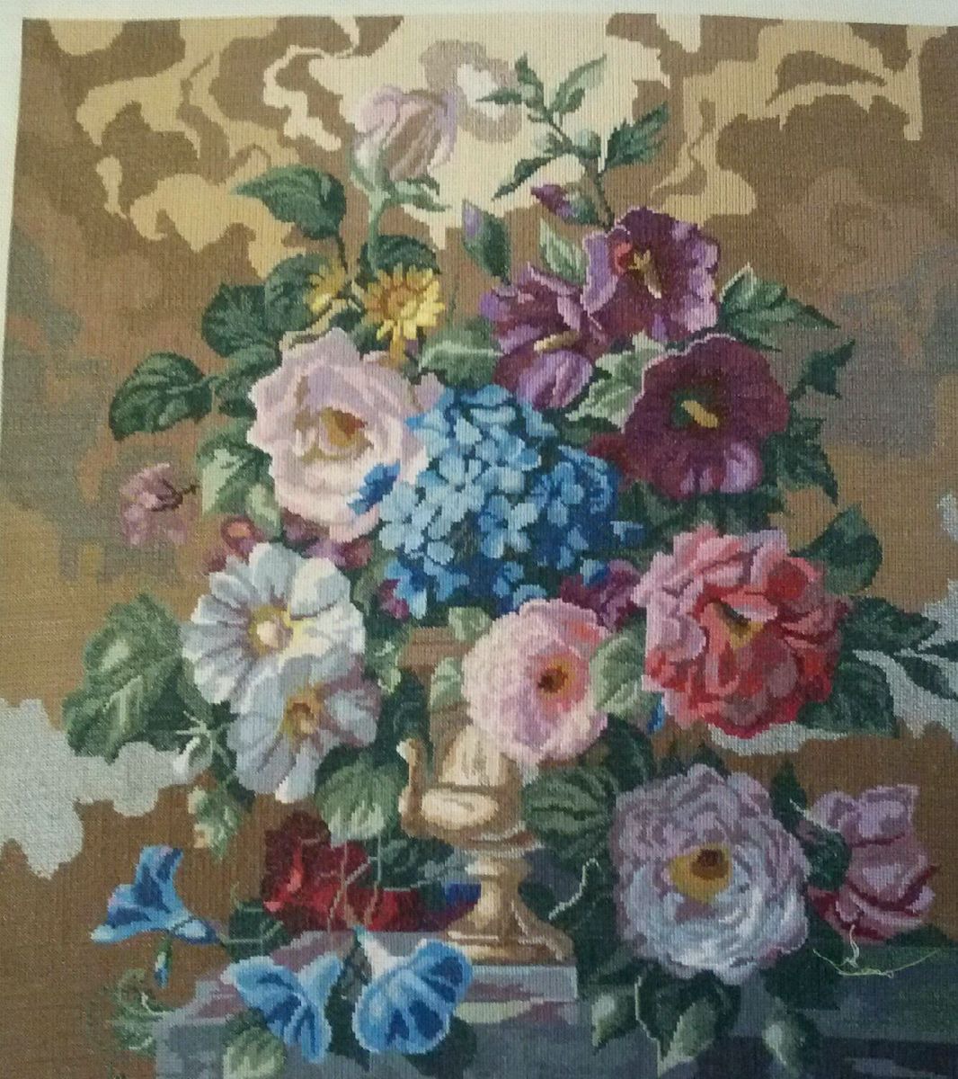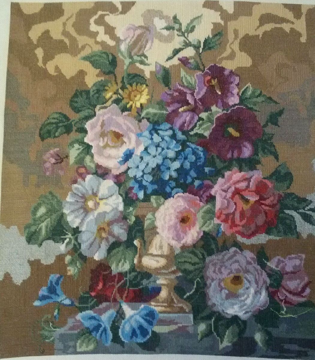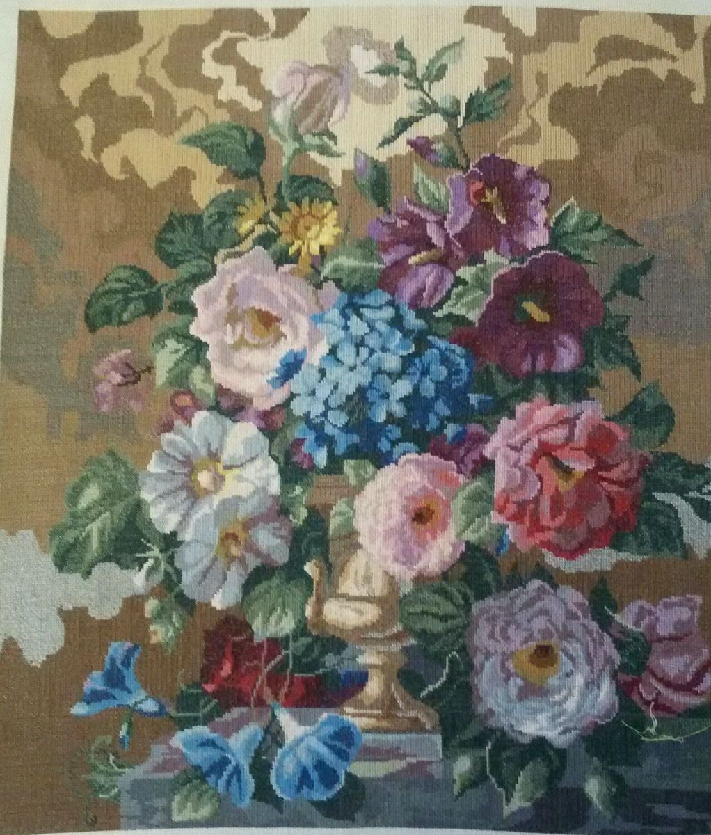 В этой вышитой картине использовано 38 цветов мулине. 300 крестиков на 334 крестика. Удивительной красоты букет. Работа напоминает о средневековых гобеленах. Такая картина станет украшением любой гостиной. Осталось только хозяину этой красоты подобрать на свой вкус раму.