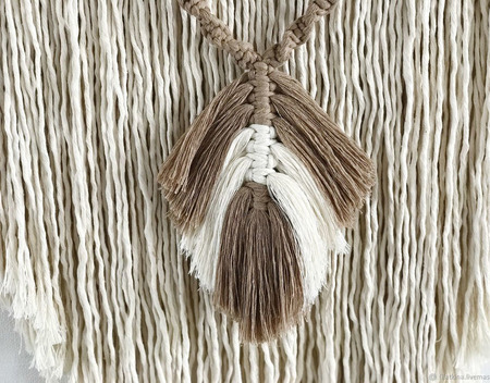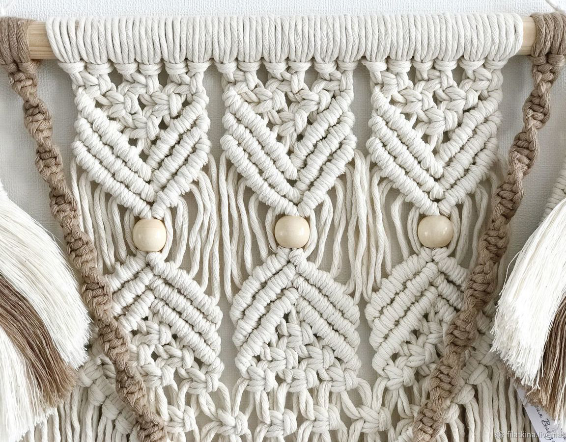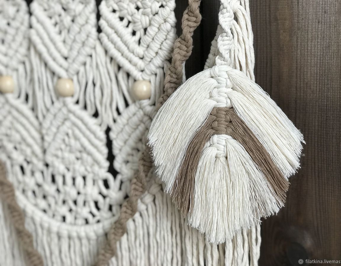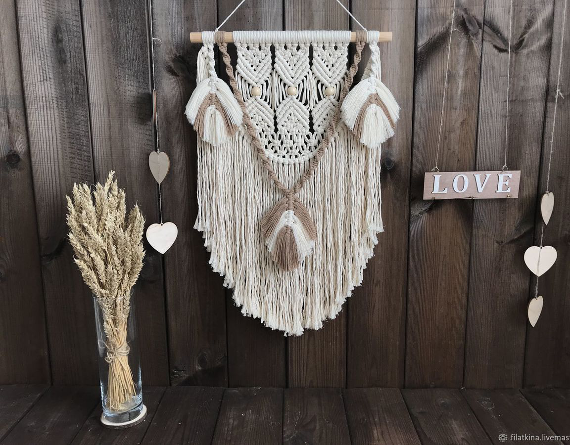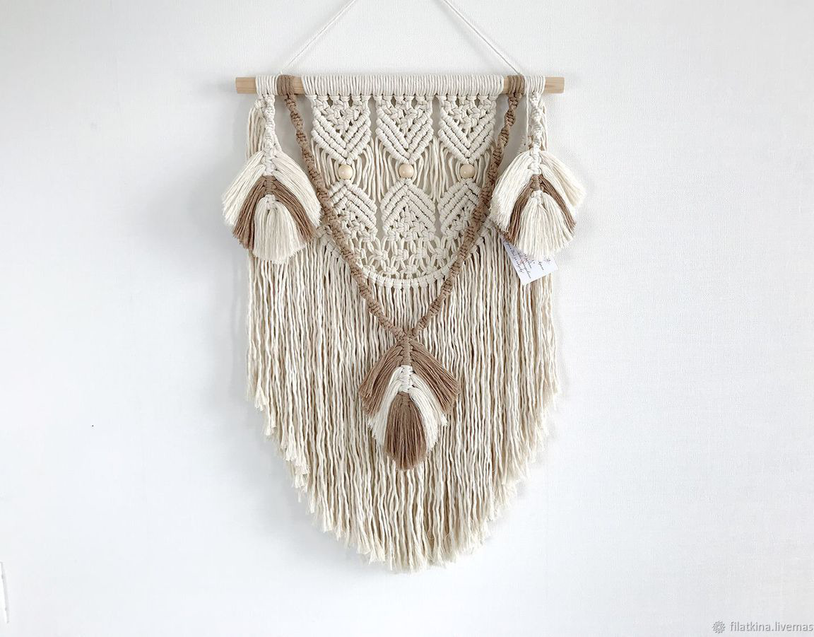 Материал: мягкий хлопковый шпагат кремового и песочного цвета, дерево, бусины.
