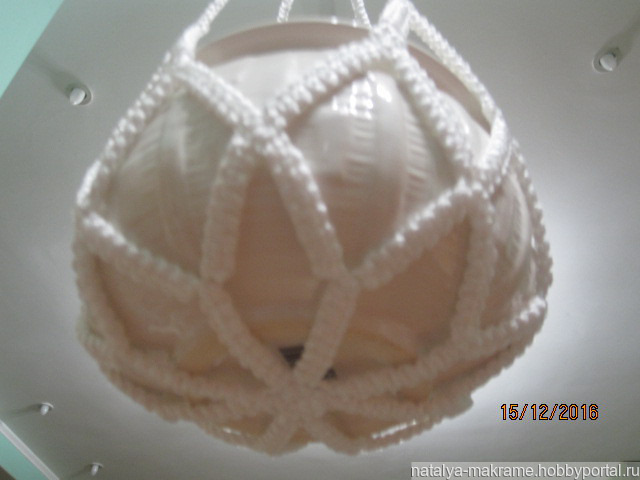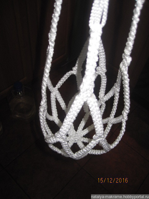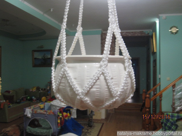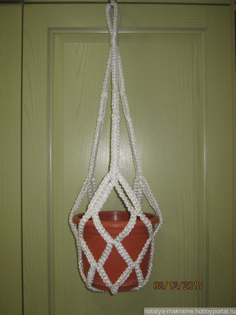 Кашпо в технике макраме, изготовлено из полиамидной нити (не выгорает, моется, можно использовать и дома, и на улице). Цвет белый. Продается без горшка.