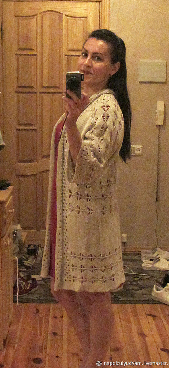 Легкий светло-бежевый вязаный ажурный кардиган-накидка без застёжек из смесовой пряжи лён-хлопок-полиакрил, размер оверсайз - подойдет от 46 до 52 размера, длина кардигана 93 см ( мой рост на фото 163 см) . Очень стильный и универсальный - " и в пир, и в мир, и в добрые люди" . Отлично подойдет в качестве подарка.
