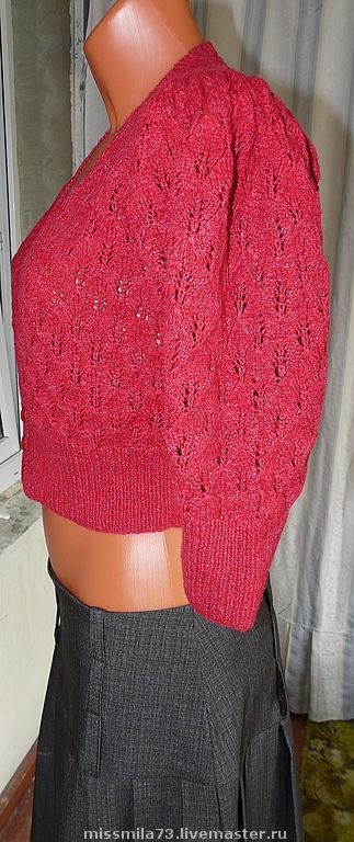 Ажурное болеро выполнено из полушерстяной пряжи, рукава длиной 3/4 (чуть ниже локтя), застежка на три небольшие пуговки. Подходит для теплых осенних дней. Составит отличный комплект как с брюками (брюки, леггинсы, джеггинсы), так и со всеми фасонами юбок