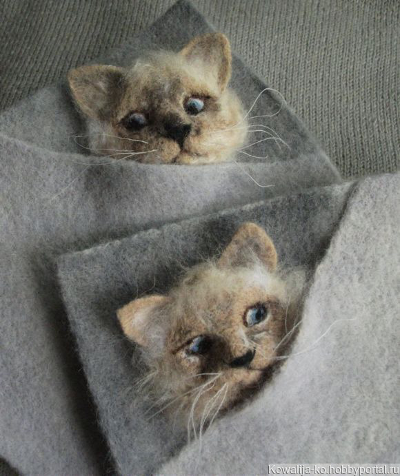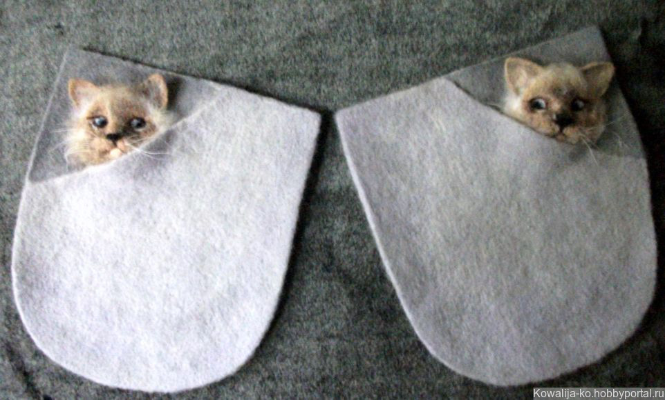 Декоративные накладные карманы. Котята. Выполнены из шерсти, полуобъемные. Основа - шерсть, размер : шир. 18см., выс. 20,5см., достаточно плотные, толщина 2,5 мм. Рекомендуется для плотного драпа , искусственного, эко меха, или для кофты плотной вязки , к ним лучше пришить подкладочную ткань желаемого цвета. Можно использовать в роли съемных карманов.