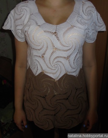 Двухцветная туника связана крючком из мотивов из 100% тонкого хлопка, имеет прямоугольную форму и спущенную пройму. Хорошо сочетается с белыми летними юбками и брюками, очень приятная к телу