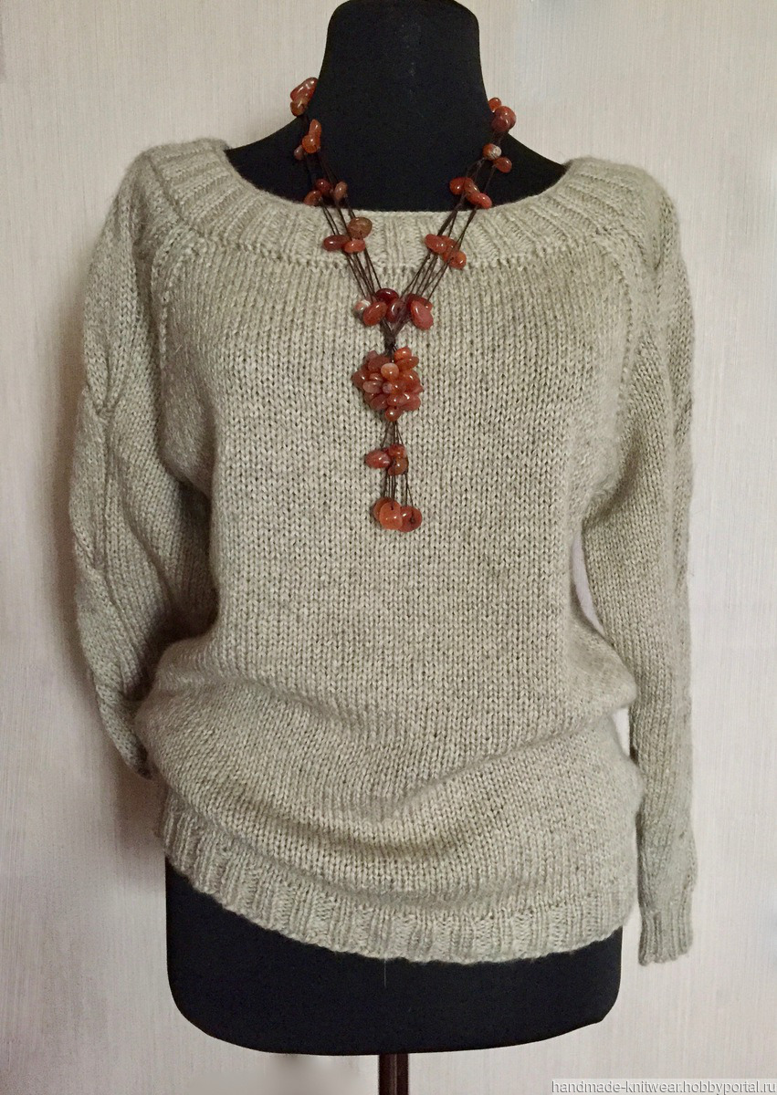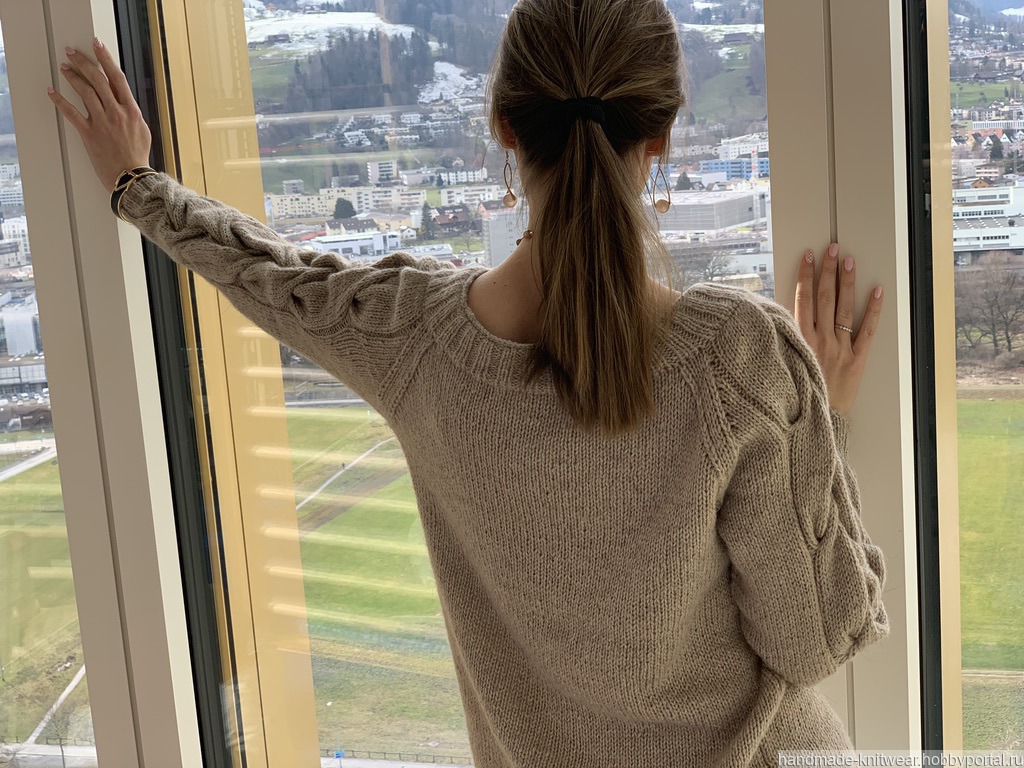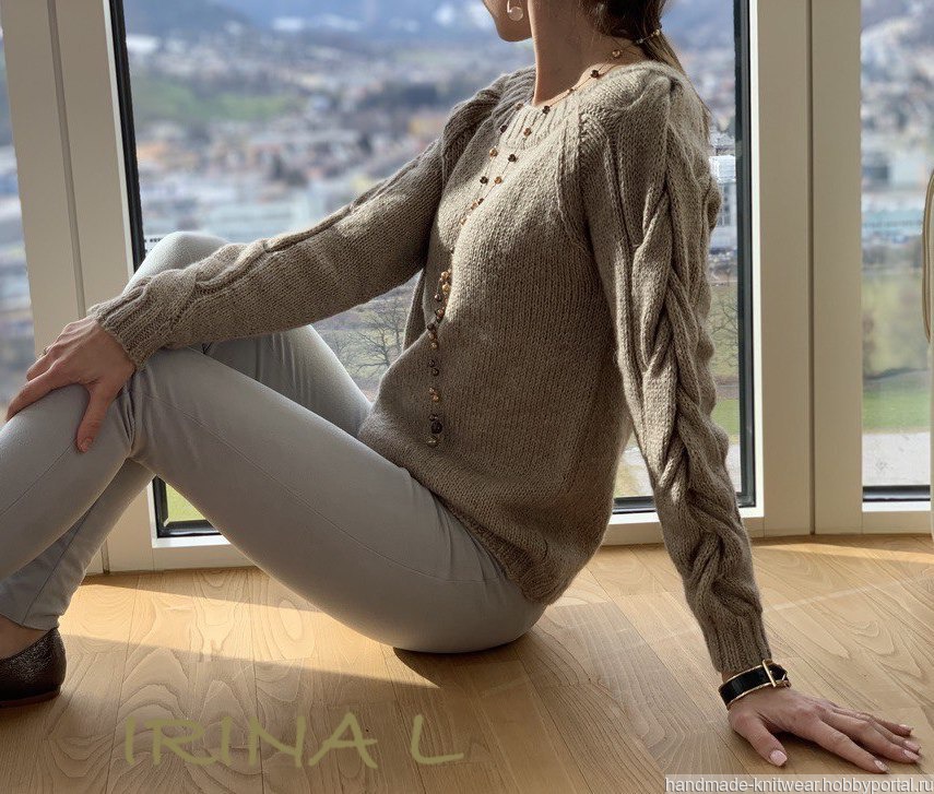 свитер женский, свитер вязаный, модный свитер, ручная работа handmade, женская одежда, модная одежда, ручная работа вязаная, джемпер спицами, ручная работа на заказ, объемные косы на рукавах, косы на рукавах, цвет каппучино, вязание на продажу