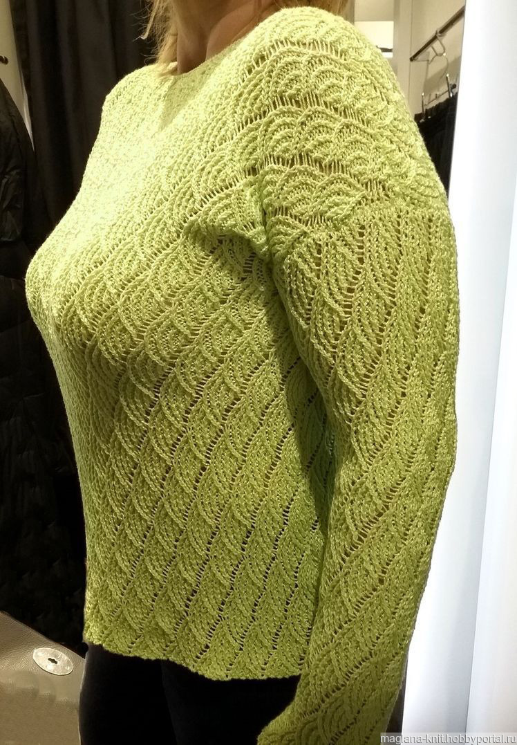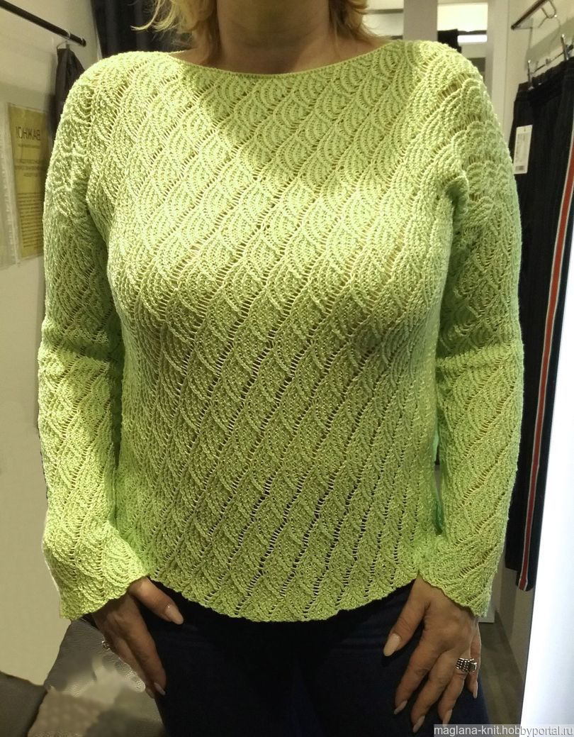 Ажурный джемпер с горловиной лодочка выполнен на заказ. Красивый узор, модный силуэт. Данный образец связан спицами из полушестяной пряжи. Для весеннего и летнего варианта возможно использование акрила, хлопка, льна, вискозы.