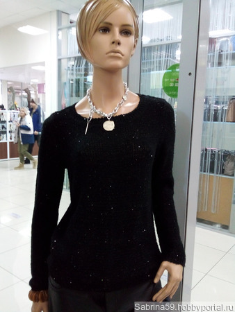 Стильный джемпер из пряжи с пайетками в классическом черном цвете. Полуприлегающий силуэт, длинный рукав. Это изделие на все случаи жизни, то есть и для вечернего выхода и для повседневного.