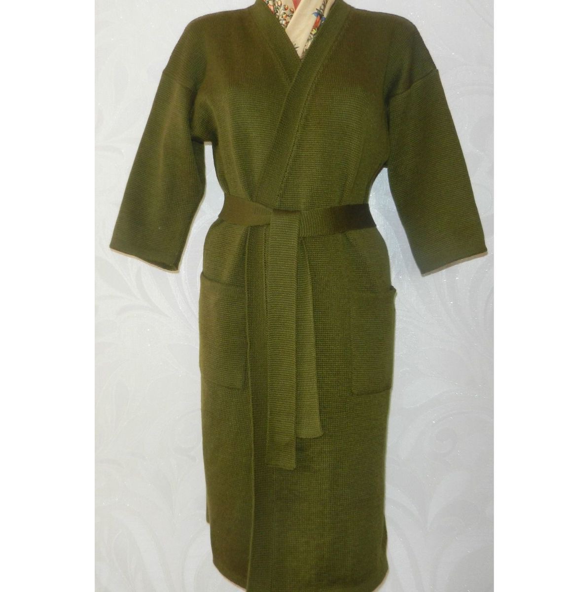 Вязаный кардиган-кимоно (или пальто)цвета хаки без застежки, с накладными карманами, без подкладки. Его можно носить нараспашку или с поясом.