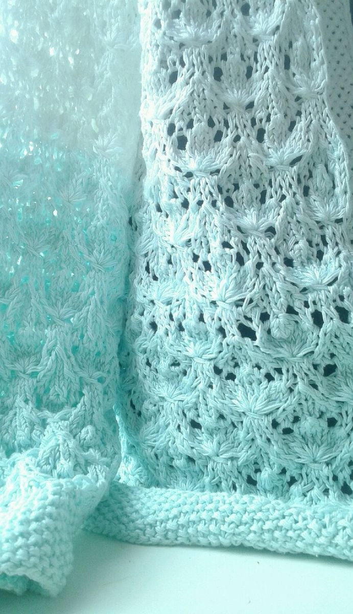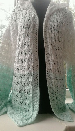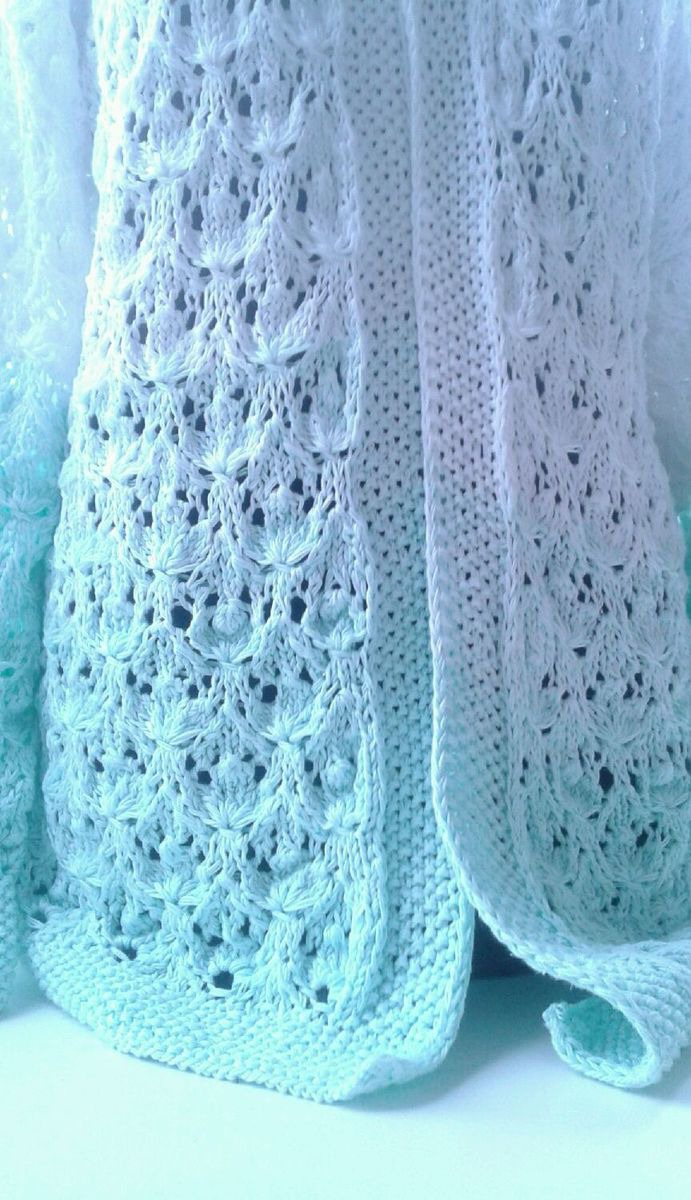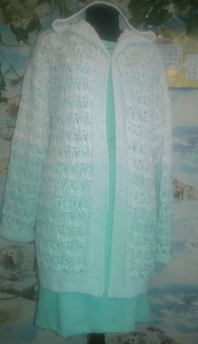 100%хлопок с градиентом от мятного до белого. Кардиган связан спицами в три нити. Капюшон. Ажурная вязка. Заниженая пройма. Без застежки. Длина 75 по спинке. Длина рукава от шеи до запястья 73. 44-46 оазмер. На заказ любой цвет и размер.