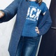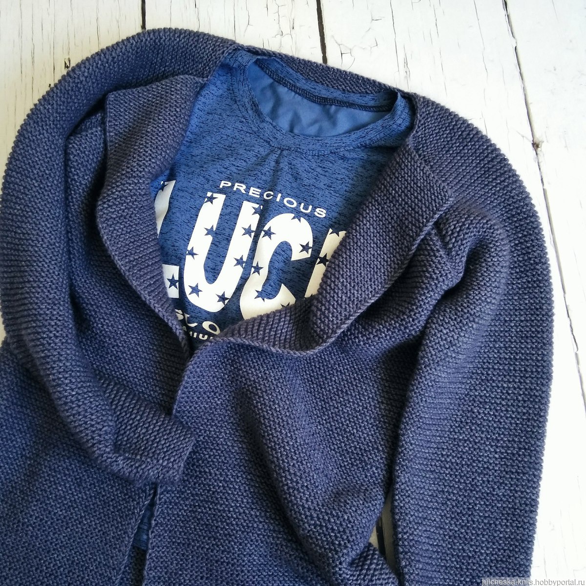 Простой и лаконичный кардиган, ничего лишнего. Связан спицами узором "платочная вязка" регланом сверху. Не имеет швов. Цвет "джинс".