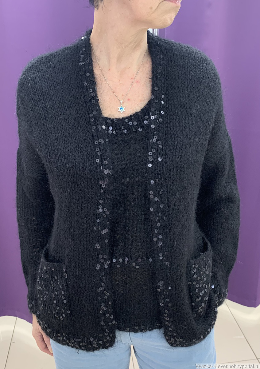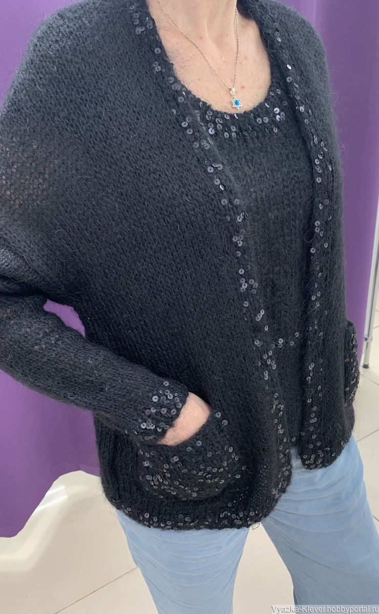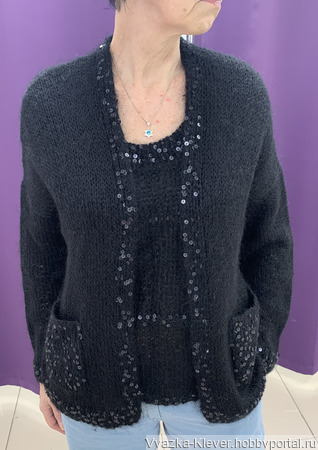 Изделие связано из мохера ALIZE - Турция черного цвета.. кардиган с манишкой С декором из нитки с равновеликими пайетками черного матового цвета придают изделию элегантность .