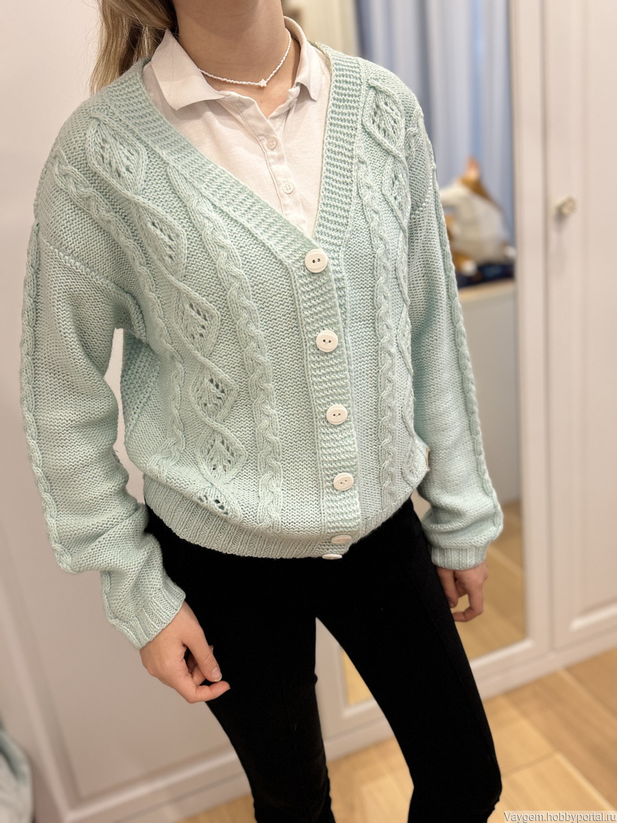 Кардиган ручной работы связан из полушерсти Alize lanagold 800 в 2 нити, но я могу связать для вас такой же из любой пряжи, любого размера и цвета. Напишите мне каким бы вы хотели видеть свой кардиган.