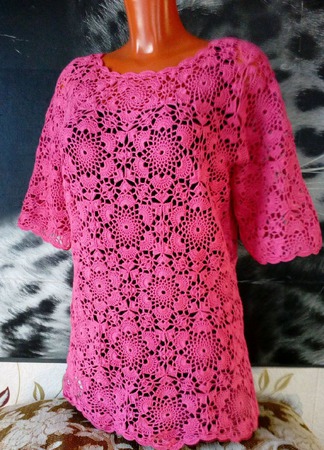 Ажурная кофточка цвета фуксии связана крючком из тончайшего мерсеризованного хлопка производства Германии в технике сцепного кружева.