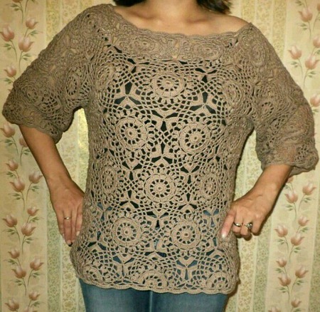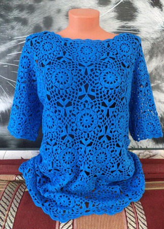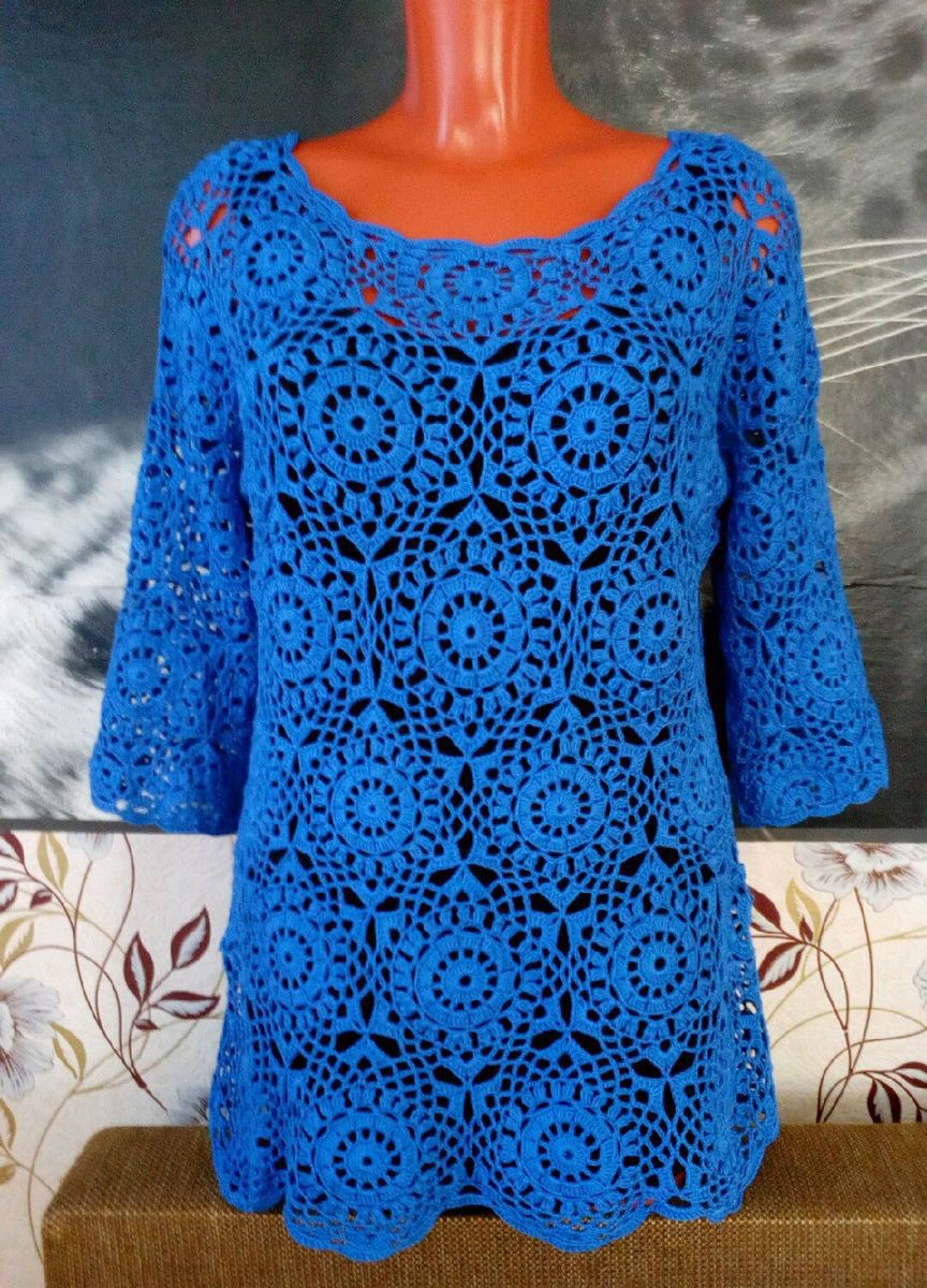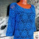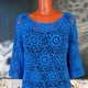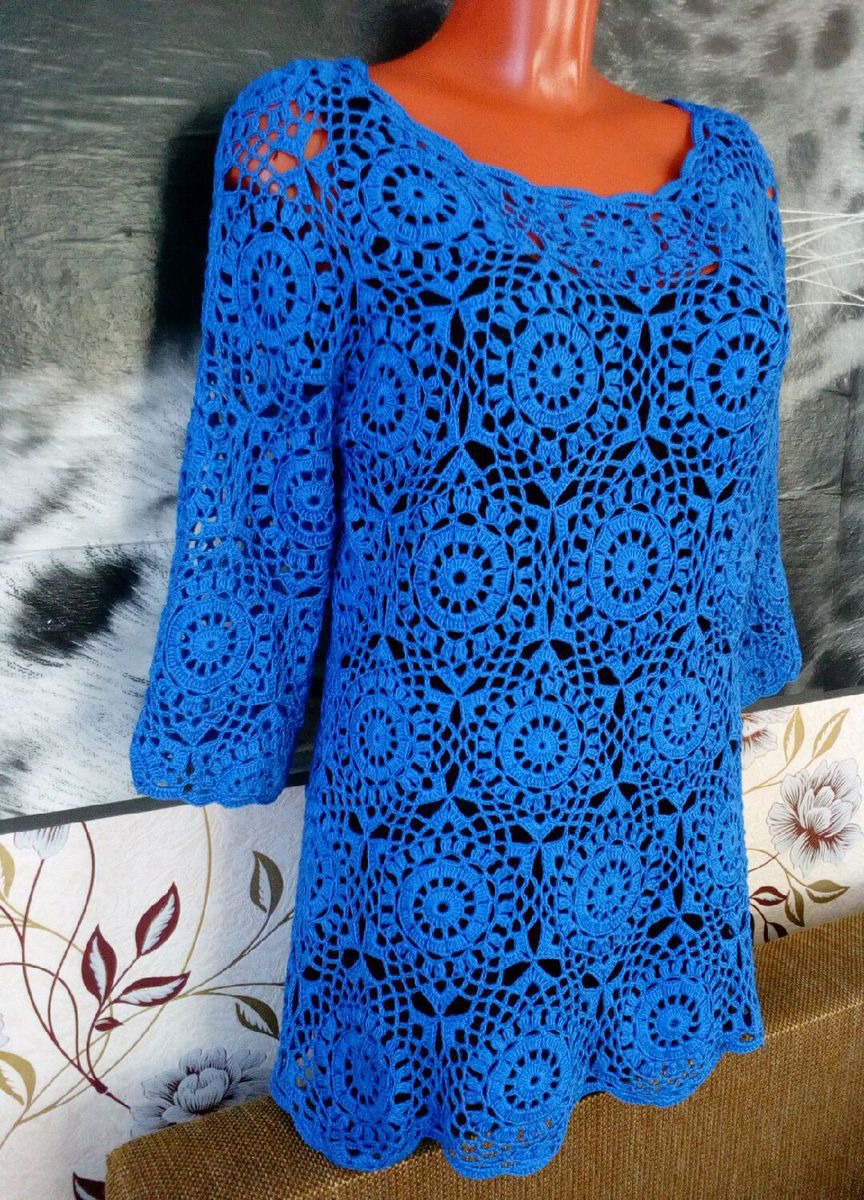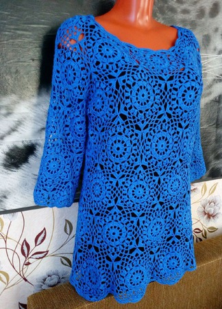 васильковый, туника, синий, кофточка, кофта, вязаная кофта, туника вязаная, джемпер, вязание крючком, женская одежда, туника крючком, кофта крючком, джемпер крючком, вязаный джемпер, ажурная кофта, пуловер крючком, модная кофта, кофта из мотивов, цветочный мотив, кофта вязанная крючком