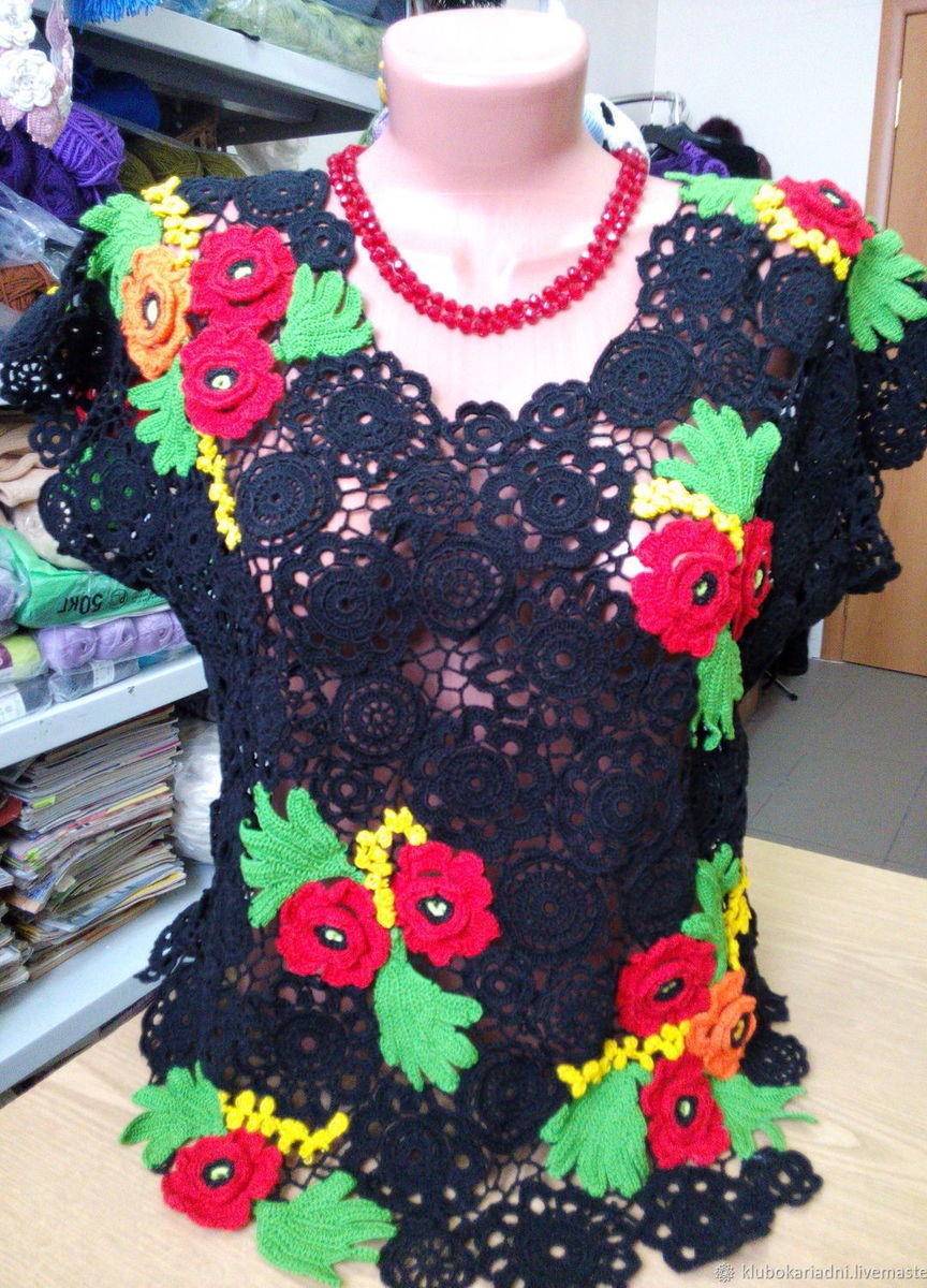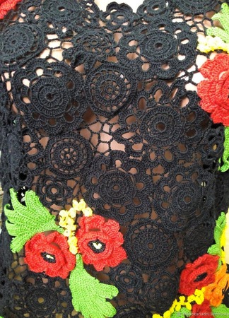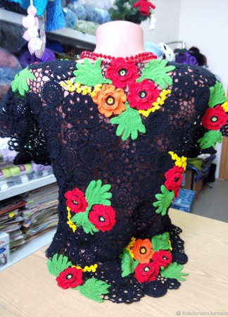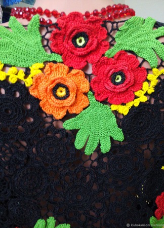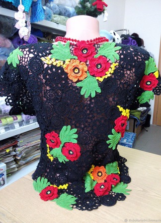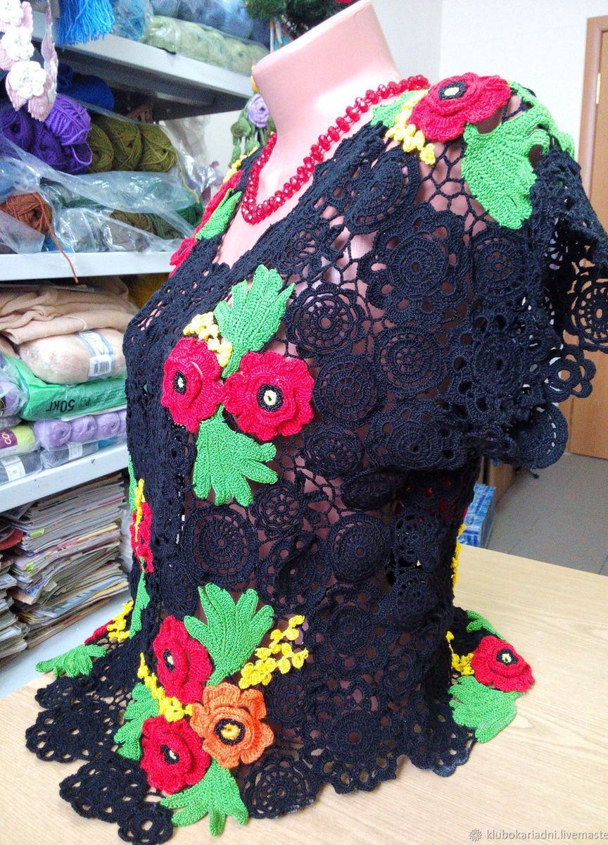 Кофточка выполнена из хлопка,в технике ирландского кружева.На чёрном фоне расположены яркие маки.