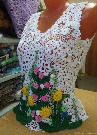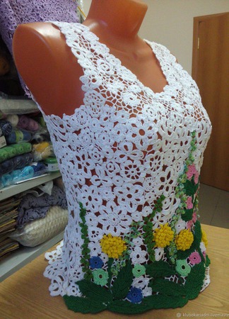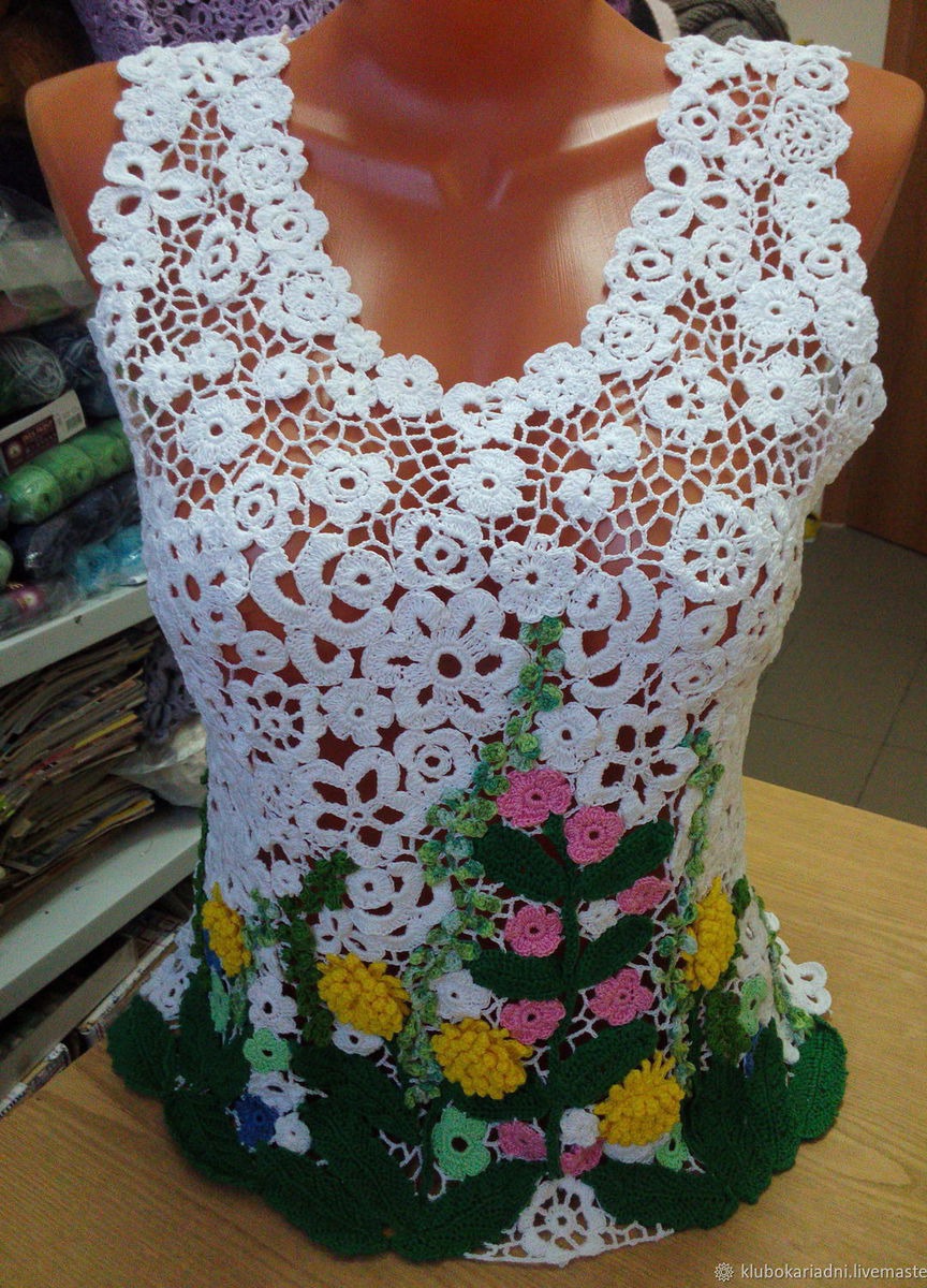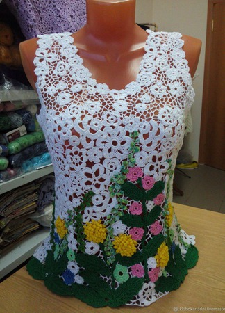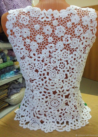 Кофточка летняя без рукава,связана крючком в смешанной технике,наборное кружево и ирландское кружево.