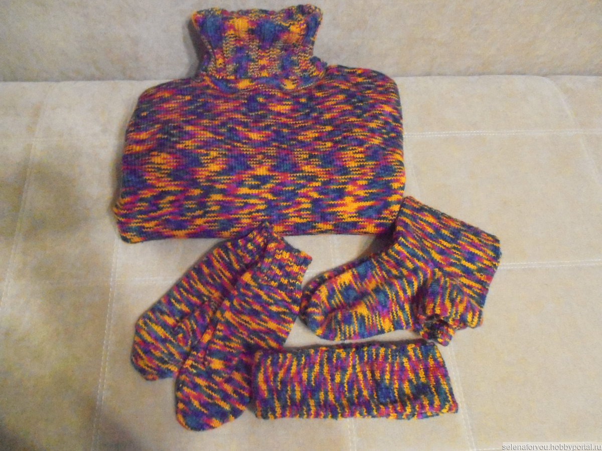 Теплый женский комплект-свитер,варежки,носки,повязка,