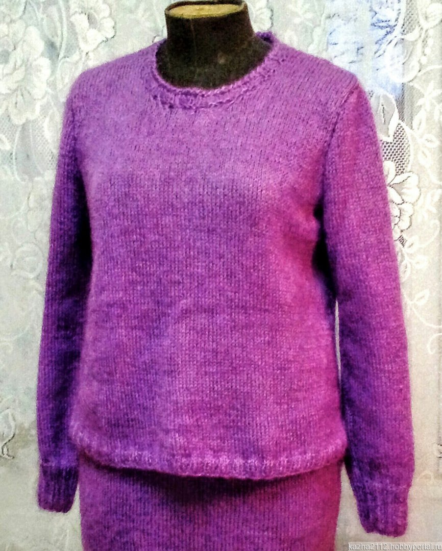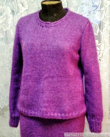 Лёгкость, свобода, нежность. Свитшот связан в виде трапеции. Спинка длиннее переда. Юбка прямая, с закруглёнными линиями бёдер. На широкой резинке.Костюм прекрасно смотрится как самостоятельная вещь, так и в ансамбле с платком, водолазками, или бижутерией.Очень комфортное изделие.
