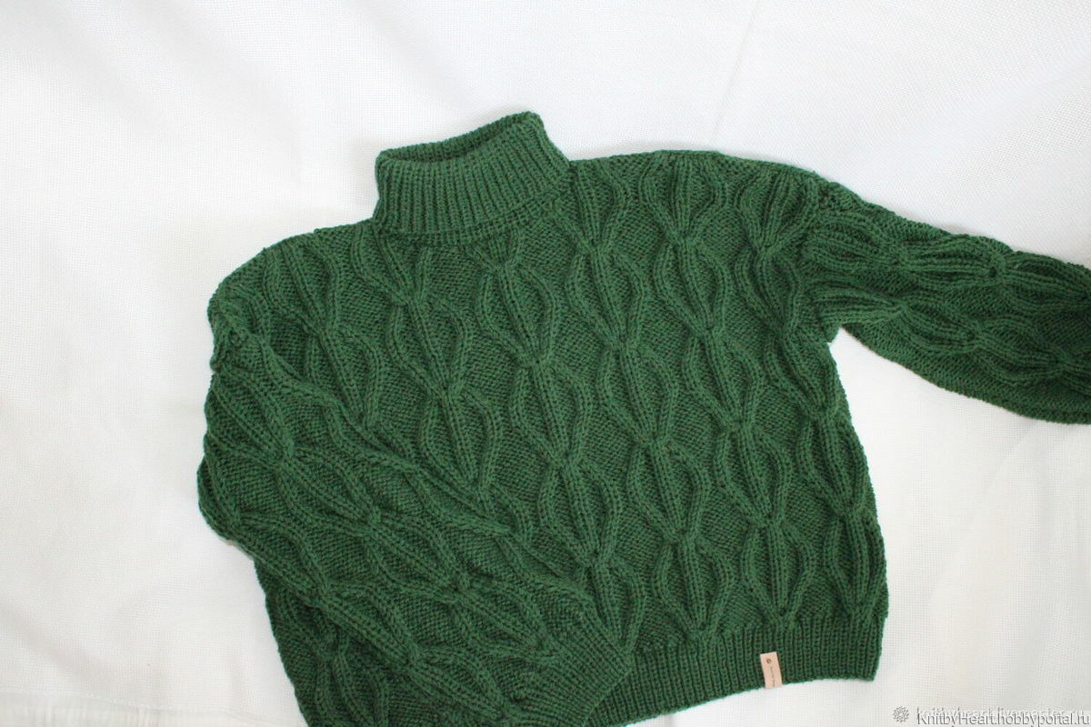 Нежный вязаный свитер с высоким горлом, связан красивым объемным узором Сердечки
