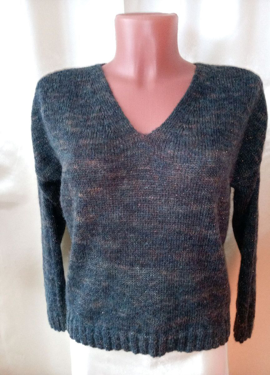 Оригинальная "хищная" окраска пуловера смягчается бронзовыми искрами. С одной стороны "ничего лишнего" позволяет носить его на работу, с другой стороны он вполне уместен на "выход". Невесомый, необычный для мохера короткий ворс - ещё одна изюминка этой модели. Связан специально для миниатюрных женщин, которым так трудно найти одежду по размеру. Прямой покрой, спущенный рукав, v-образный вырез, длина чуть ниже талии, элегантная простота.