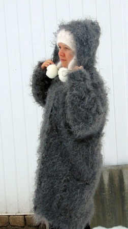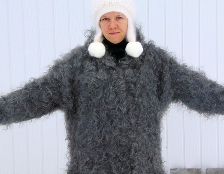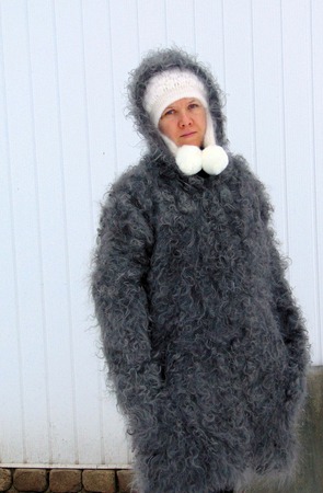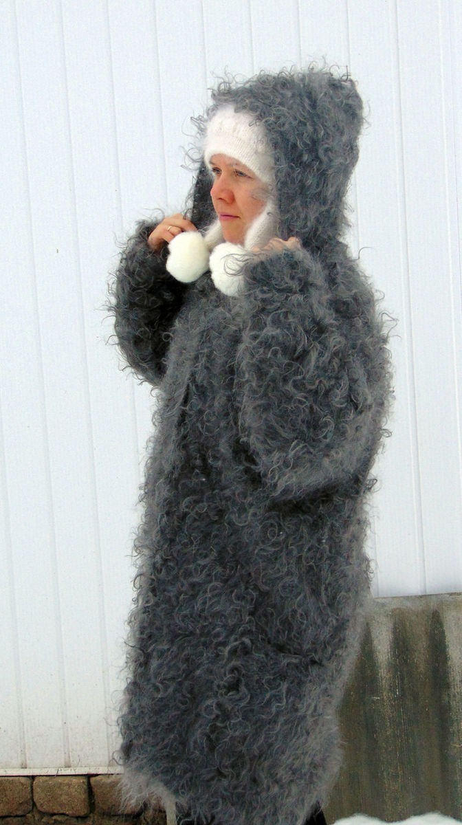 серый, кардиган вязаный, пальто, пальто с капюшоном, пальто женское, пальто пуховое, пальто кучерявое, пальто из козьего пуха
