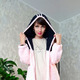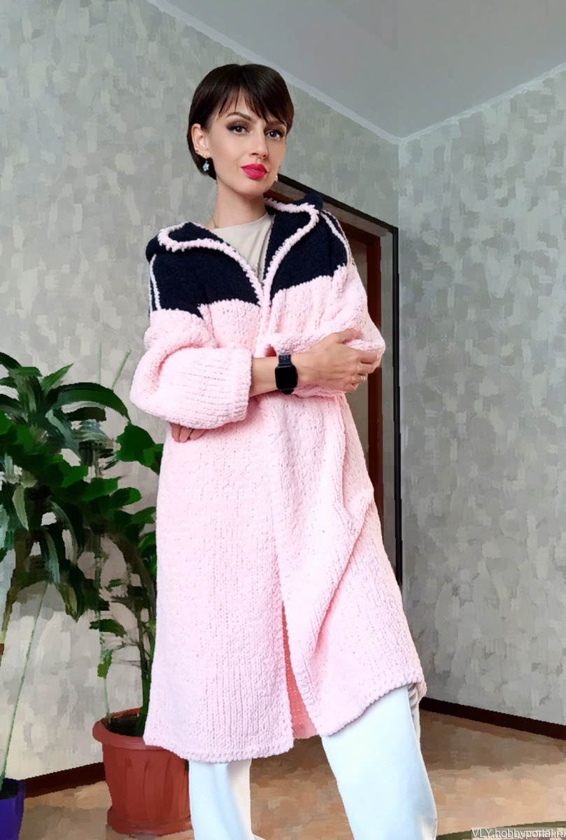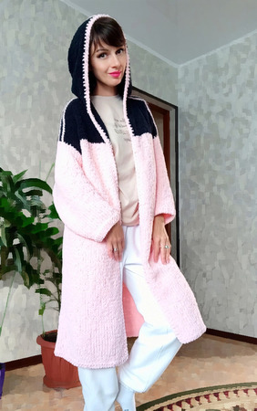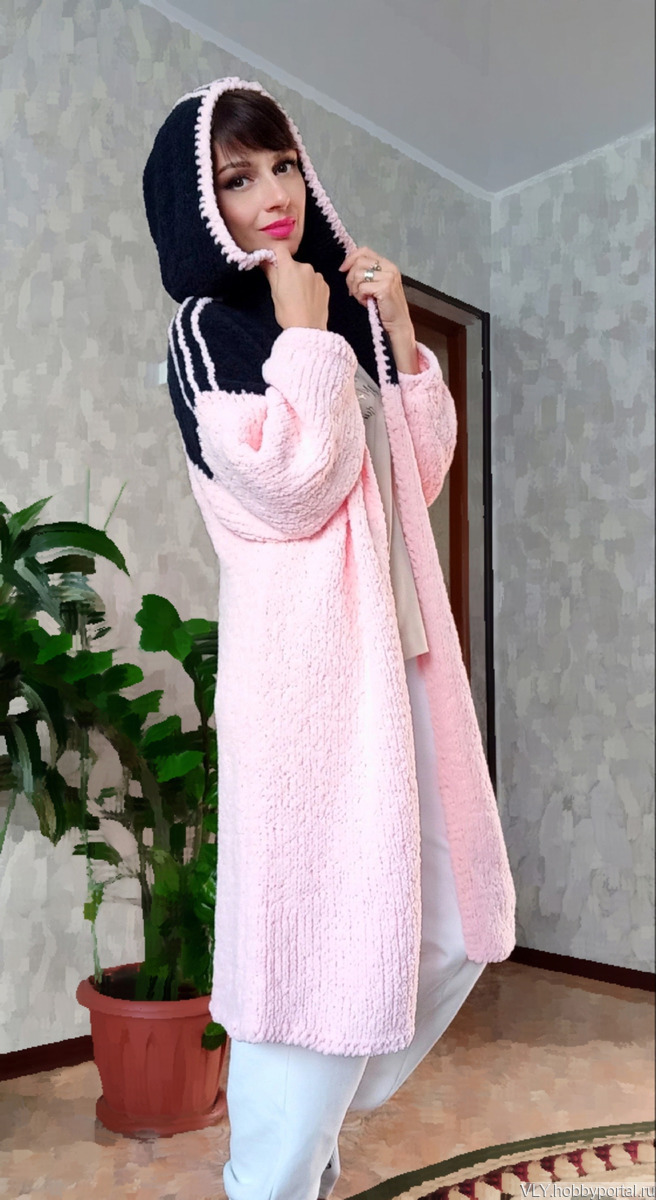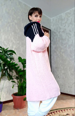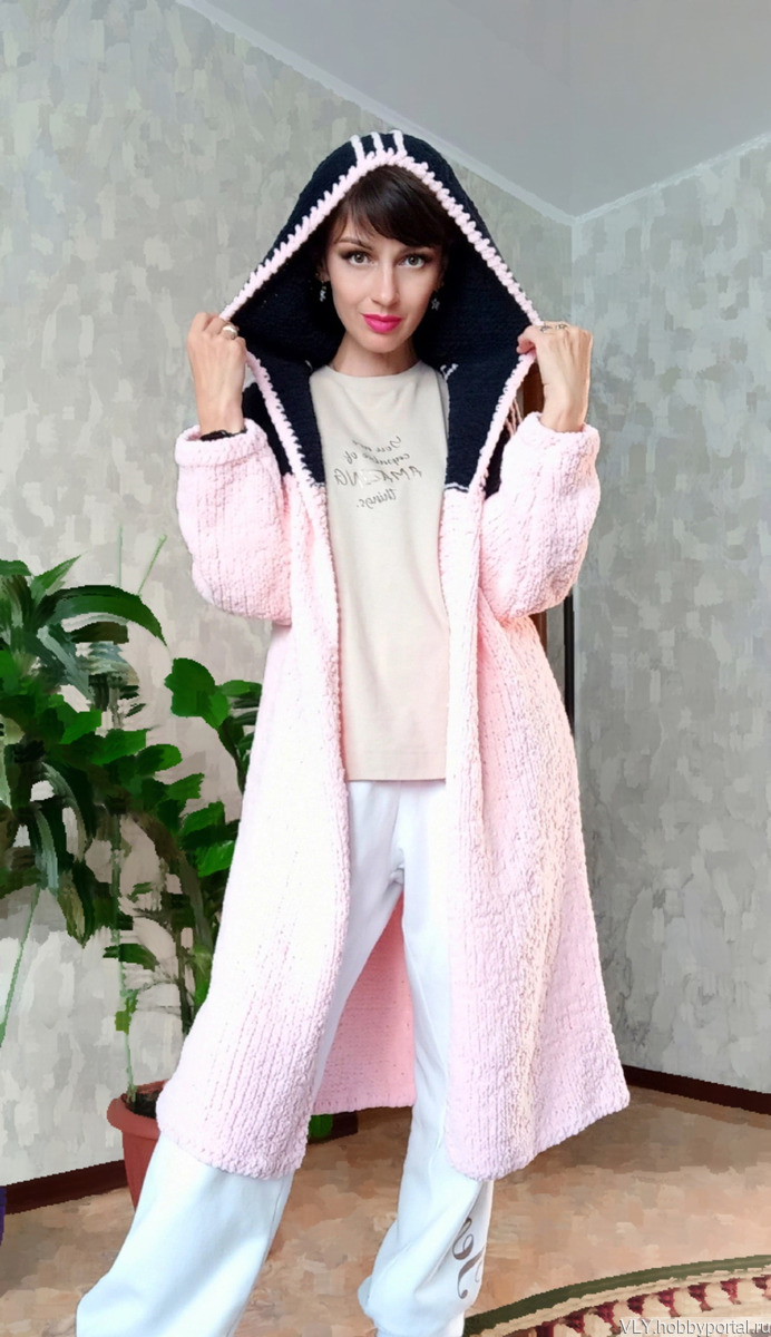 Кардиган выполнен из плюша розового цвета,капюшон чeрного цвета. Тeплый,мягкий,уютный. Не растягивается,не даeт усадку после стирки.