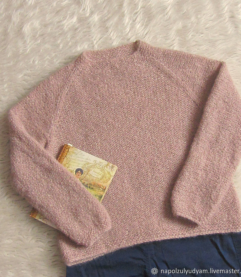 Двусторонний джемпер из роскошного итальянского мохера пудрового цвета с люрексом , мягкий , легкий ( 240 грамм) , теплый. Пряжа - элитная бобинная производства Италия. Джемпер можно носить на обе стороны, длина 50 см, ширина 46 см. Подходит на размеры 42-46. Рукава реглан . Круглый вырез шею не давит . Абсолютно неколючий - из остатков пряжи связала дочке топ с короткими рукавами - поддевает только бюстгальтер ( рост дочки на фото - 158 см) . Ненавязчивый люрекс золотистого цвета красиво оттеняет саму пряжу.