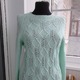 Пуловер выполнен из пряжи "Пехорка" "Ангорская тёплая" 40% шерсть 60% ПАН объемный, 100 грамм 480 метров, ушло 3 моточка, размер 46-48, цвет нежный мятный, пряжа нежная, мягенькая, колючесть отсутствует полностью, к телу приятный, комфортный.