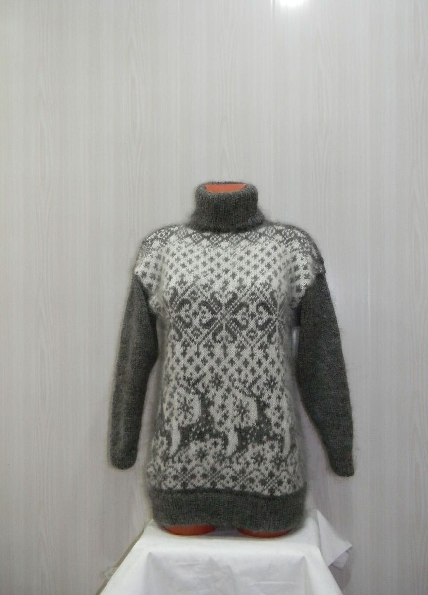 свитер, черно-белый, вязаный, подарок к праздникам, парню, свитер с оленями, изделия из козьего пуха, пуховый свитер, пуховое изделие, купить пуховое изделие, свитер из кашемира, свитер унисекс, купить свитер с оленями, свитер скандинавский узор, серый свитер с оленями